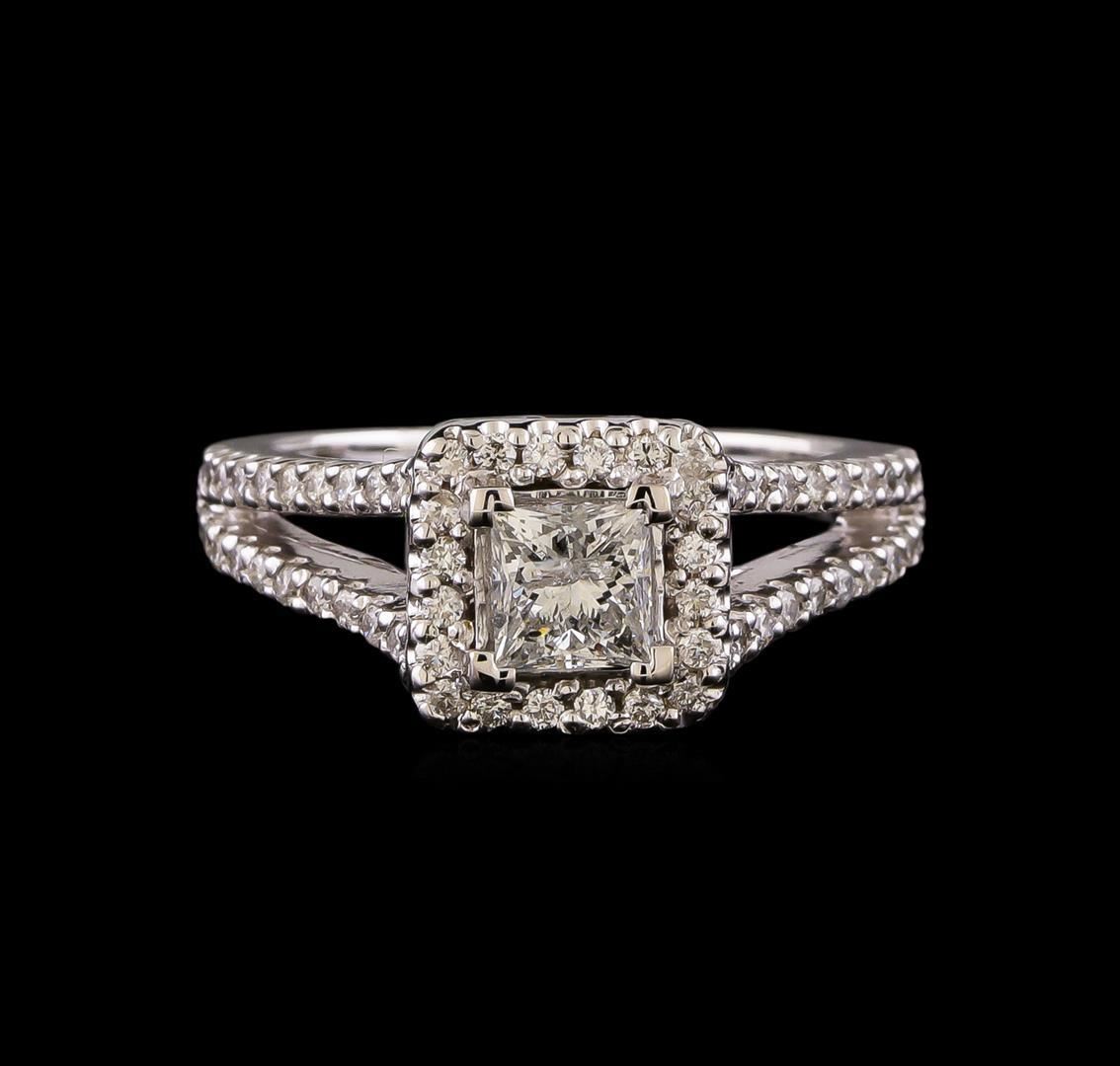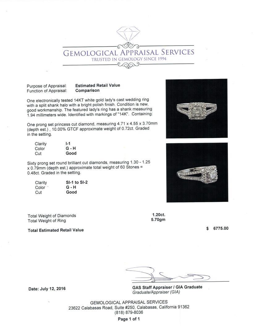 One electronically tested 14KT white gold lady's cast wedding ring with a split shank halo with a bright polish finish. The featured lady's ring has a shank measuring 1.94 millimeters wide. Identified with markings of '14K'. Condition is new, good workmanship. Containing: One prong set princess cut diamond, measuring 4.71 x 4.55 x 3.70mm (depth est.) , 10.00.%. GTCF approximate weight of 0.72ct. Graded in the setting. Clarity I-1. Color: G - H Cut Good Sixty prong set round brilliant cut diamonds, measuring 1.30 - 1.25 x 0.79mm (depth est.) approximate total weight of 60 Stones = 0.48ct. Graded in the setting. Clarity SI-1 to SI-2. Color: G - H Cut Good. Total Weight of Diamonds 1.20ct.. Total Weight of Ring 5.70gm. GAS Appraised.