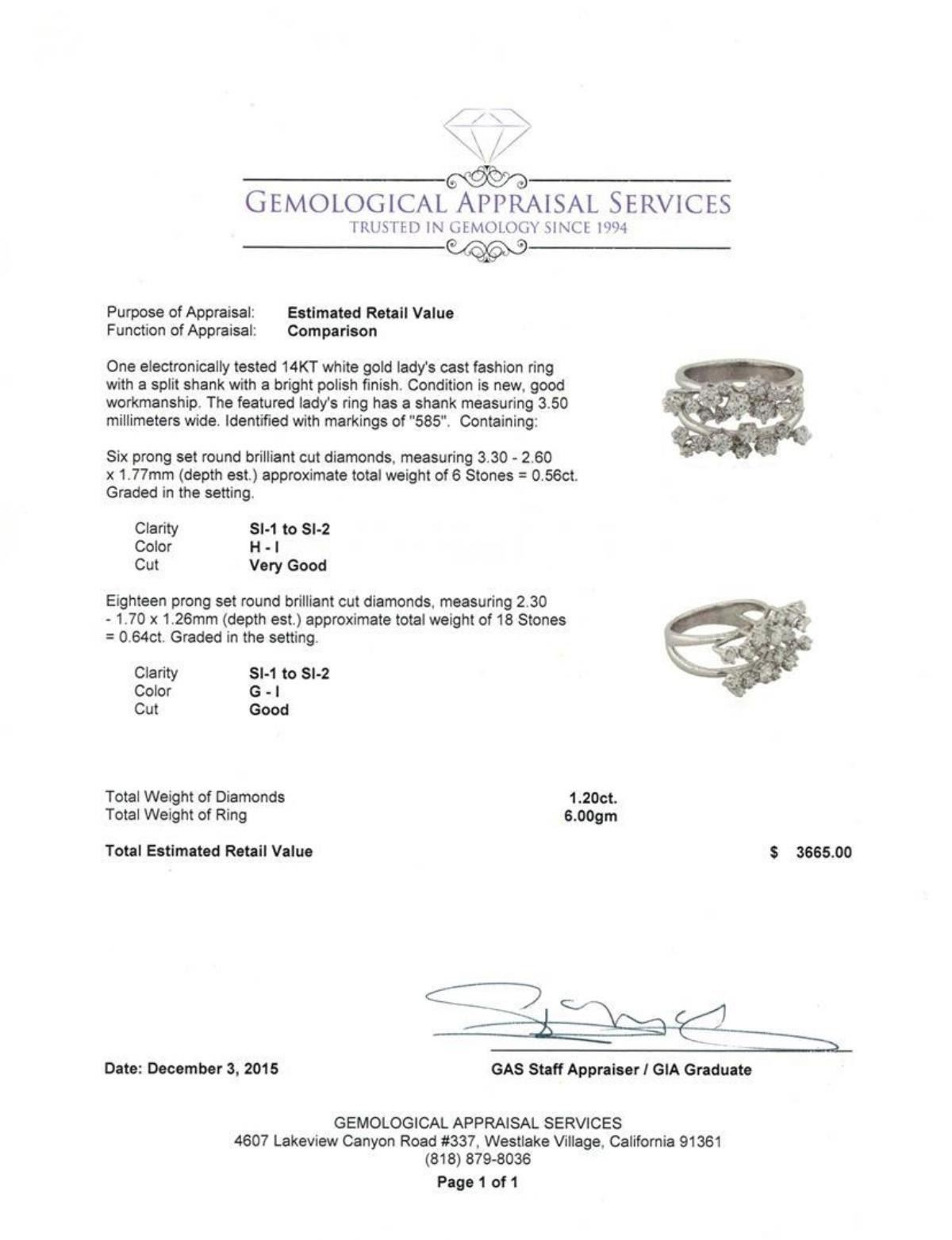 One electronically tested 14KT white gold lady's cast fashion ring with a split shank with a bright polish finish. The featured lady's ring has a shank measuring 3.50 millimeters wide. Identified with markings of "585". Condition is new, good workmanship. Containing: Six prong set round brilliant cut diamonds, measuring 3.30 - 2.60 x 1.77mm (depth est.) approximate total weight of 6 Stones = 0.56ct. Graded in the setting. Clarity: SI-1 to SI-2. Color: H - I. Cut Very Good Eighteen prong set round brilliant cut diamonds, measuring 2.30 - 1.70 x 1.26mm (depth est.) approximate total weight of 18 Stones = 0.64ct. Graded in the setting. Clarity: SI-1 to SI-2. Color: G - I. Cut Good. Total Weight of Diamonds 1.20ct. Total Weight of Ring 6.00gm. GAS Appraised.