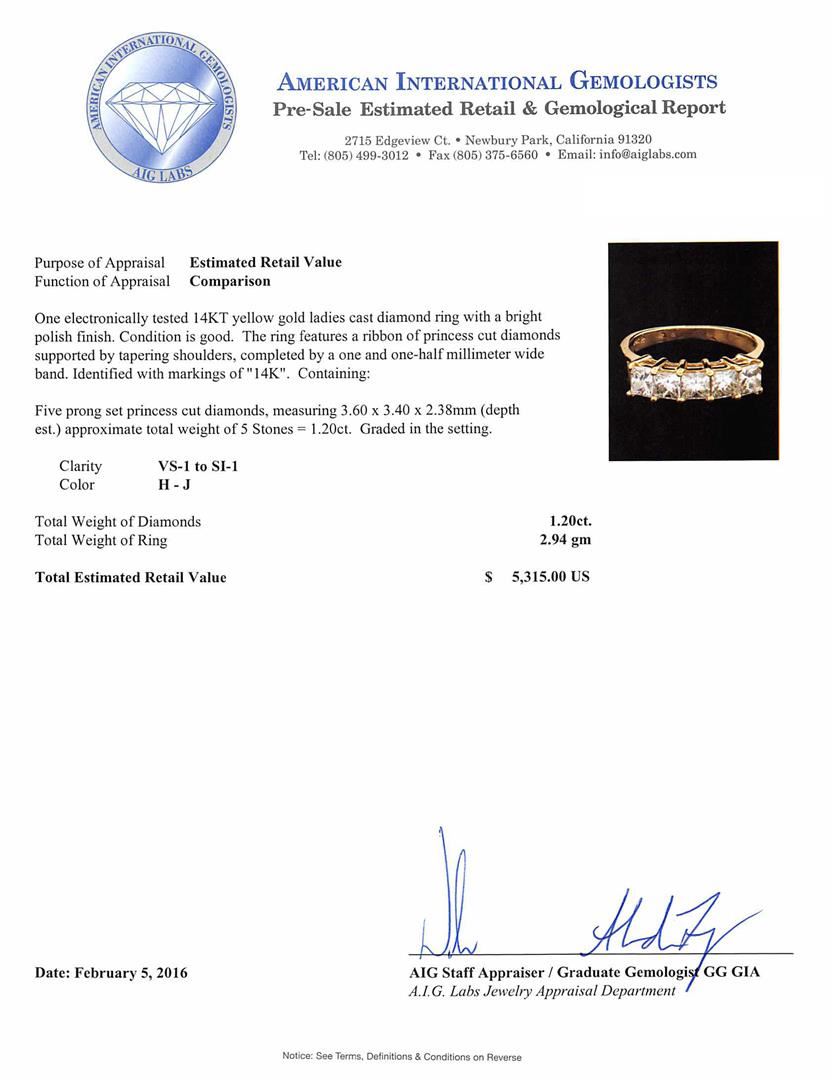 One electronically tested 14KT yellow gold ladies cast diamond ring with a bright polish finish. The ring features a ribbon of princess cut diamonds supported by tapering shoulders, completed by a one and one-half millimeter wide band. Identified with markings of "14K". Condition is good. Containing: Five prong set princess cut diamonds, measuring 3.60 x 3.40 x 2.38mm (depth est.) approximate total weight of 5 Stones = 1.20ct. Graded in the setting. Clarity: VS-1 to SI-1. Color: H - J. Total Weight of Diamonds 1.20ct. Total Weight of Ring 2.94gm. AIG Appraised at $5,315.00.