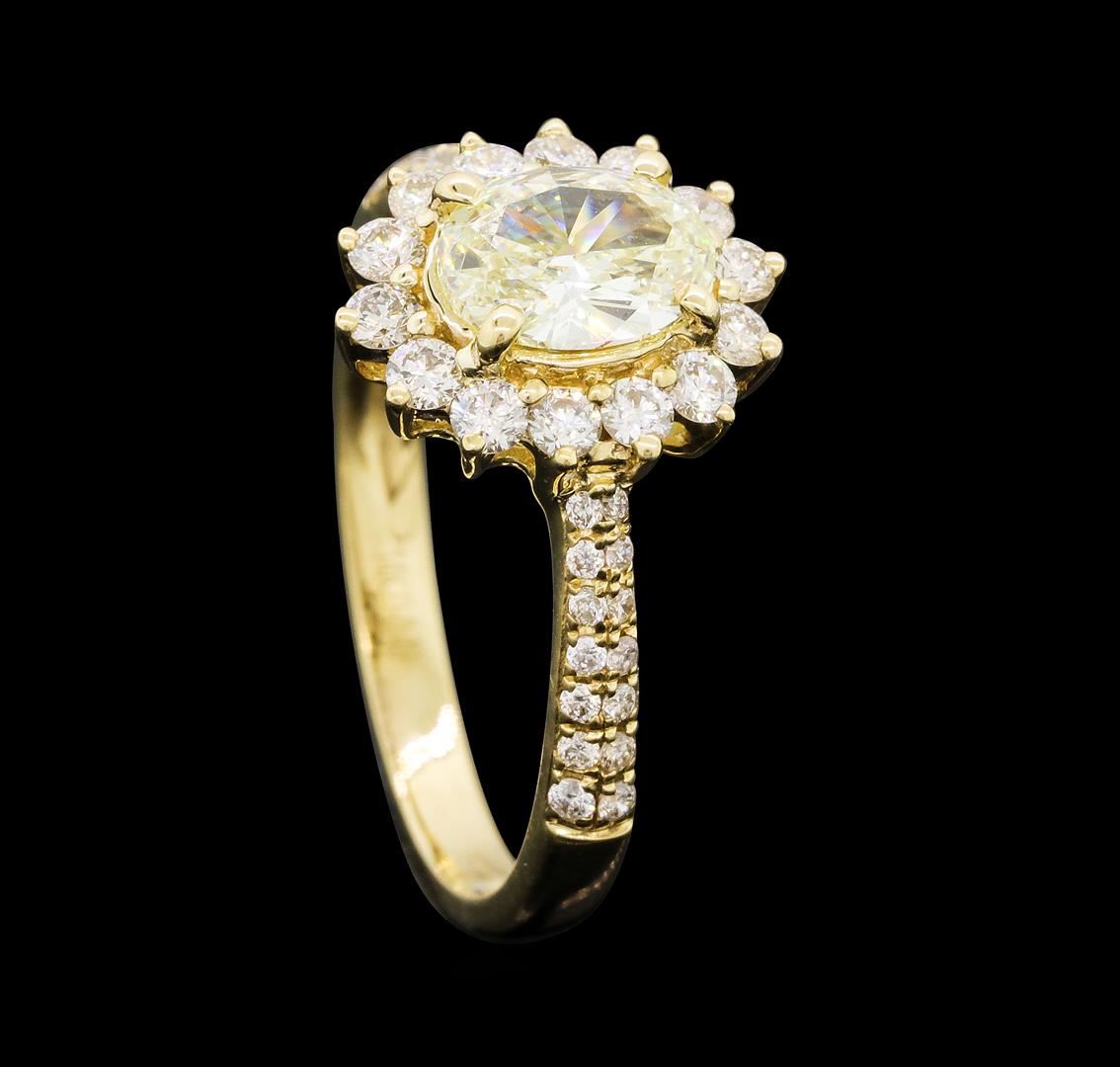 One electronically tested 14KT yellow gold lady's cast wedding ring with a scalloped basket halo with a bright polish finish. The featured lady's ring has a shank measuring 2.20 millimeters wide. Identified with markings of '14K'. Condition is new, good workmanship. Containing: One prong set oval shaped cut diamond, measuring 6.90 x 5.21 x 2.60mm (depth est.) , 15.00.%. GTCF approximate weight of 0.71ct. Graded in the setting. Color Fancy Light Yellow Clarity VS-2 Cut Very Good Fourteen prong set round brilliant cut diamonds, measuring 2.00 - 1.90 x 1.17mm (depth est.) approximate total weight of 14 Stones = 0.38ct. Graded in the setting. Color H - I Clarity VS-2 to SI-1 Cut Very Good Twenty-Eight prong set round brilliant cut diamonds, measuring 1.10 - 0.95 x 0.62mm (depth est.) approximate total weight of 28 Stones = 0.11ct. Graded in the setting. Color G - H Clarity SI-1 to SI-2 Cut Very Good. Total Weight of Diamonds 1.20 ct.. Total Weight of Ring 2.40gm GAS Appraised.