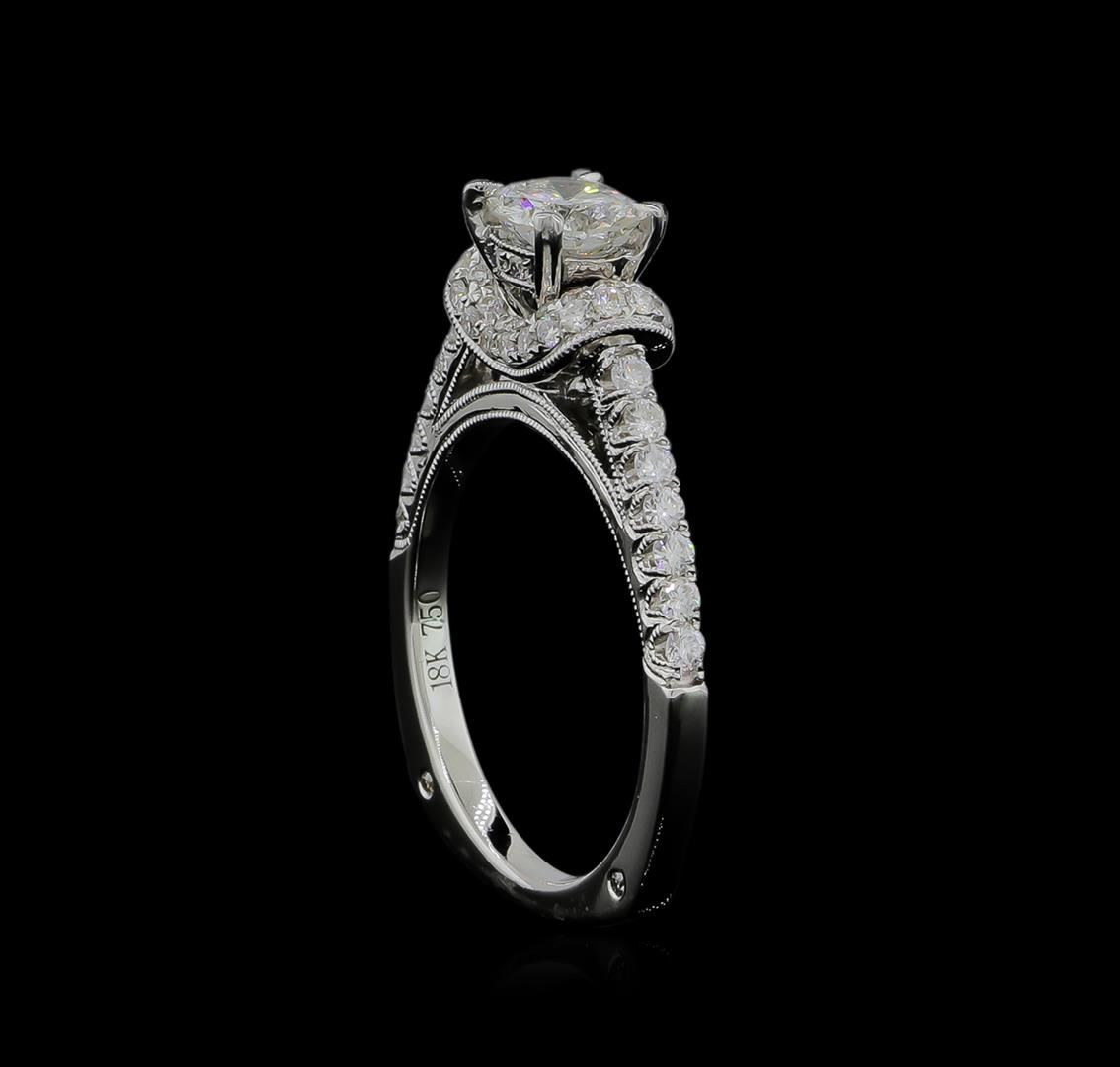 One electronically tested 18KT white gold ladies cast diamond unity ring. The featured diamond is set within a stylized diamond bezel supported by an elaborate under gallery and diamond set shoulders, completed by a one and one-half millimeter wide band. Bright polish finish with milgrain detailing. Identified with markings of "18K 750". Condition is new, good workmanship. Containing: One prong set round brilliant cut diamond, measuring 5.29 - 5.28 x 3.17mm (depth est.) approximate weight of 0.58ct. Graded in the setting. Clarity: I-1. Color: I. Depth 59.9%. Table 71.8%. Fourteen prong set round brilliant cut diamonds, measuring 1.70 - 1.60 x 0.99mm (depth est.) approximate total weight of 14 Stones = 0.30ct. Graded in the setting. Clarity: SI-1 to SI-2. Color: F - H Forty-Four prong & bezel set round brilliant cut diamonds, measuring 1.20 - 1.10 x 0.69mm (depth est.) approximate total weight of 44 Stones = 0.32ct. Graded in the setting. Clarity: SI-1 to SI-2. Color: F - H. Total Weight of Diamonds 1.20ct. Total Weight of Ring 5.31gm. AIG Appraised at $6,565.00.