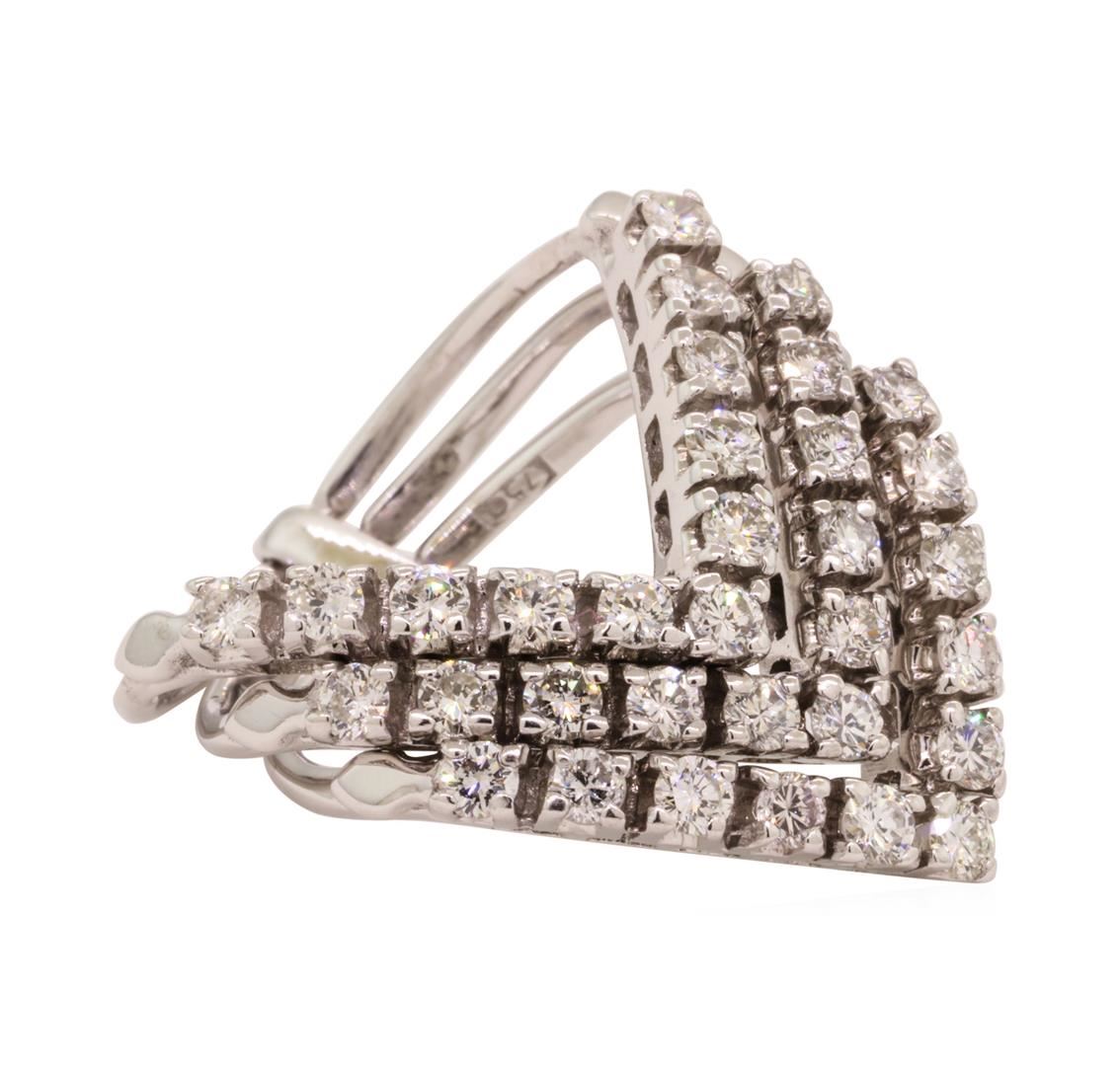One electronically tested 18KT white gold lady's combination cast & assembled fashion ring with a triple chevron motif with a bright polish finish. The featured lady's ring is composed of three hinged, attached bands and has a shank measuring 6.67 millimeters wide. Identified with markings of '750'. Condition is like new, good workmanship. Containing: Thirty-Three prong set round brilliant cut diamonds, measuring 2.20 - 2.00 x 1.30mm (depth est.) approximate total weight of 33 Stones = 1.20ct. Graded in the setting. Color H - I Clarity VS-1 to SI-1 Cut Very Good. Total Weight of Diamonds 1.20ct.. Total Weight of Ring 6.50gm GAS Appraised at $4260.00. GAS Appraised at $4,260.00.