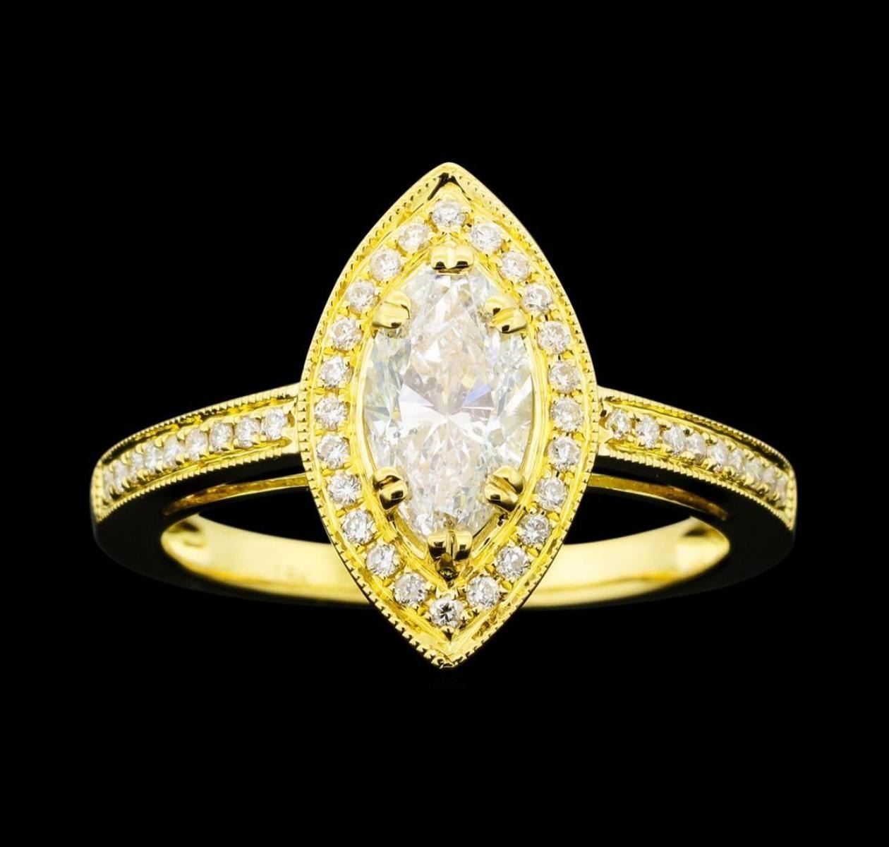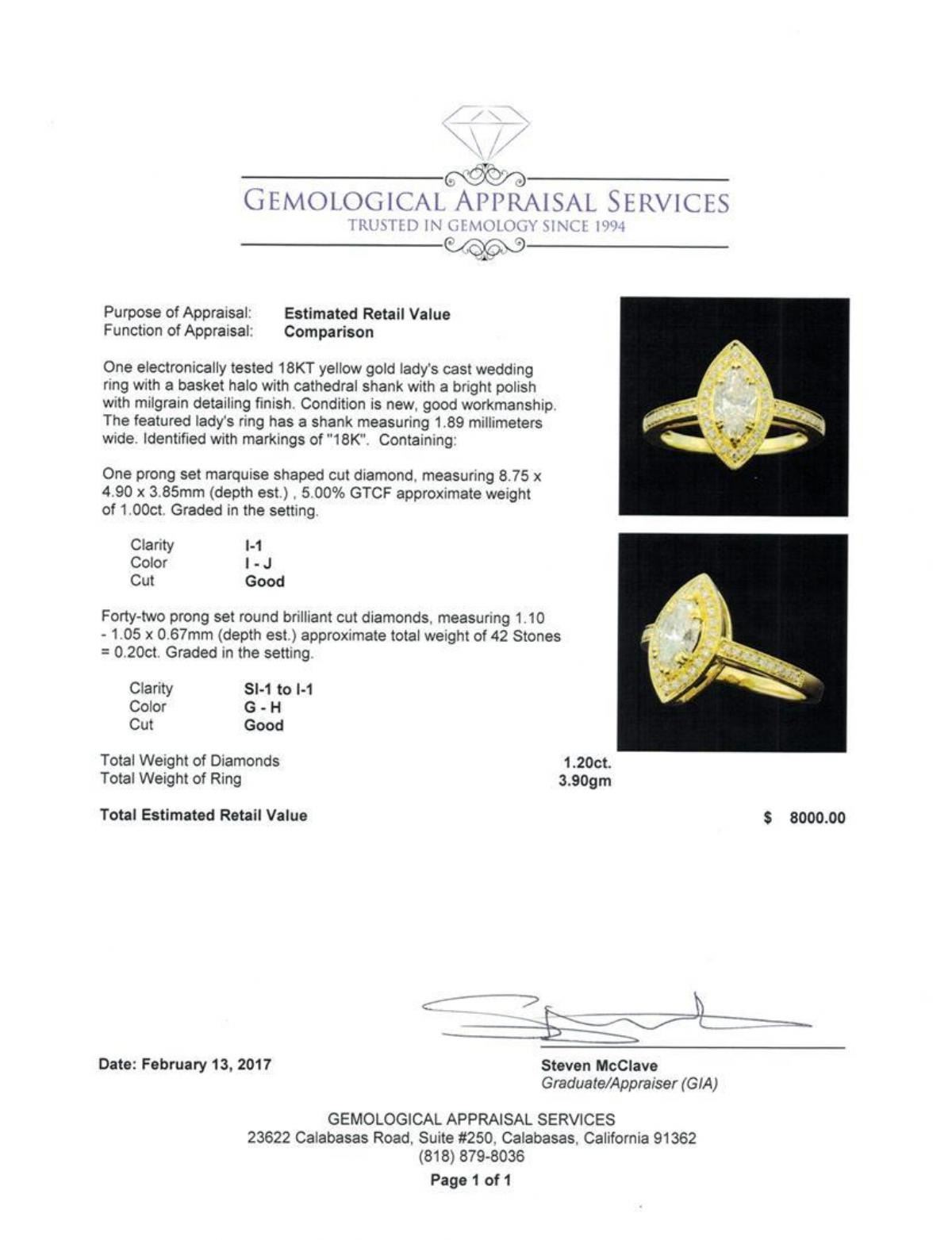 One electronically tested 18KT yellow gold lady's cast wedding ring with a basket halo with cathedral shank with a bright polish with milgrain detailing finish. The featured lady's ring has a shank measuring 1.89 millimeters wide. Identified with markings of '18K'. Condition is new, good workmanship. Containing: One prong set marquise shaped cut diamond, measuring 8.75 x 4.90 x 3.85mm (depth est.) , 5.00.%. GTCF approximate weight of 1.00 ct. Graded in the setting. Clarity I-1. Color: I - J Cut Good Forty-Two prong set round brilliant cut diamonds, measuring 1.10 - 1.05 x 0.67mm (depth est.) approximate total weight of 42 Stones = 0.20 ct. Graded in the setting. Clarity SI-1 to I-1. Color: G - H Cut Good. Total Weight of Diamonds 1.20 ct.. Total Weight of Ring 3.90gm. GAS Appraised.
