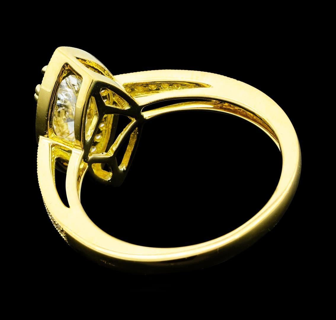 One electronically tested 18KT yellow gold lady's cast wedding ring with a basket halo with cathedral shank with a bright polish with milgrain detailing finish. The featured lady's ring has a shank measuring 1.89 millimeters wide. Identified with markings of '18K'. Condition is new, good workmanship. Containing: One prong set marquise shaped cut diamond, measuring 8.75 x 4.90 x 3.85mm (depth est.) , 5.00.%. GTCF approximate weight of 1.00 ct. Graded in the setting. Clarity I-1. Color: I - J Cut Good Forty-Two prong set round brilliant cut diamonds, measuring 1.10 - 1.05 x 0.67mm (depth est.) approximate total weight of 42 Stones = 0.20 ct. Graded in the setting. Clarity SI-1 to I-1. Color: G - H Cut Good. Total Weight of Diamonds 1.20 ct.. Total Weight of Ring 3.90gm. GAS Appraised.