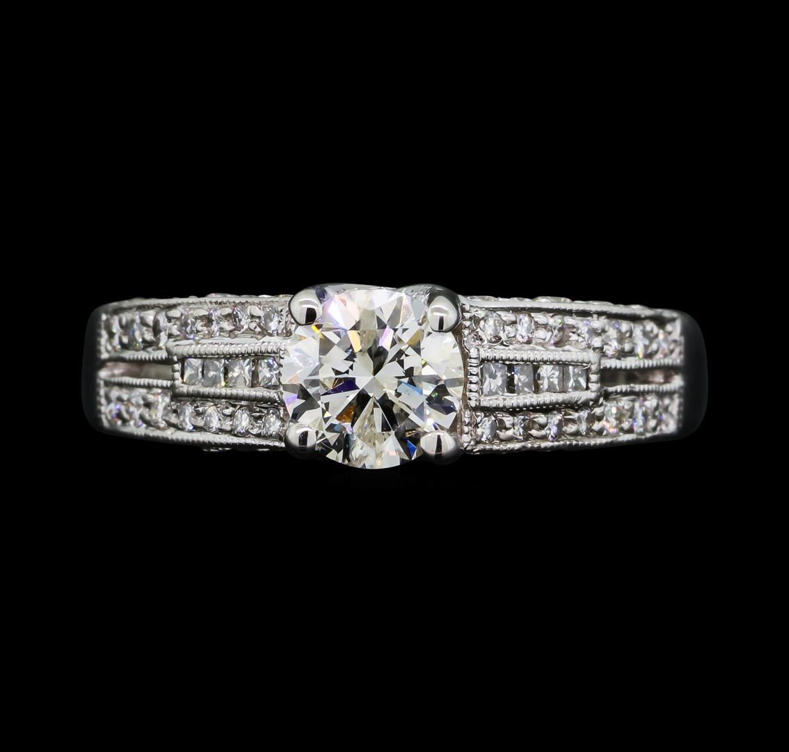 One electronically tested platinum lady's cast wedding ring with a tapered cathedral shank with a bright polish with milgrain detailing finish. The featured lady's ring has a shank measuring 2.60 millimeters wide. Trademark is spark. Identified with markings of 'PT'. Condition is new, good workmanship. Containing: One prong set round brilliant cut diamond, measuring 5.64 - 5.59 x 3.55mm (depth est.) , 5.00.%. GTCF approximate weight of 0.73ct. Graded in the setting. Clarity I-1. Color: I - J Cut Good Eight channel set princess cut diamonds, measuring 1.10 x 1.00 x 0.75mm (depth est.) approximate total weight of 8 Stones = 0.05ct. Graded in the setting. Clarity SI-1 to I-1. Color: G - H Cut Very Good Eight prong set round brilliant cut diamonds, measuring 1.60 - 1.40 x 0.93mm (depth est.) approximate total weight of 8 Stones = 0.11ct. Graded in the setting. Clarity VS-2 to SI-1. Color: G - H Cut Very Good Forty-Eight prong set round brilliant cut diamonds, measuring 1.30 - 1.10 x 0.74mm (depth est.) approximate total weight of 48 Stones = 0.31ct. Graded in the setting. Clarity VS-2 to SI-1. Color: G - H Cut Very Good. Total Weight of Diamonds 1.20ct.. Total Weight of Ring 6.50gm GAS Appraised at $6,695.00.