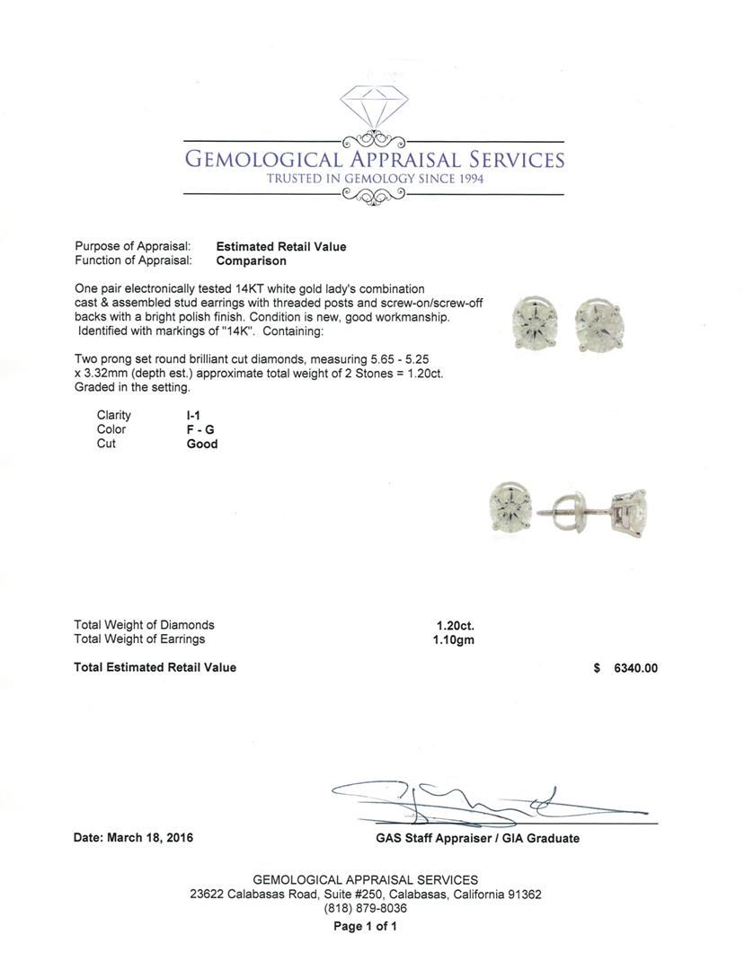 One pair electronically tested 14KT white gold lady's combination cast & assembled stud earrings with threaded posts and screw-on/screw-off backs with a bright polish finish. Identified with markings of "14K". Condition is new, good workmanship. Containing: Two prong set round brilliant cut diamonds, measuring 5.65 - 5.25 x 3.32mm (depth est.) approximate total weight of 2 Stones = 1.20ct. Graded in the setting. Clarity: I-1. Color: F - Good. Total Weight of Diamonds 1.20ct. Total Weight of Earrings 1.10gm. GAS Appraised at $6,340.00.