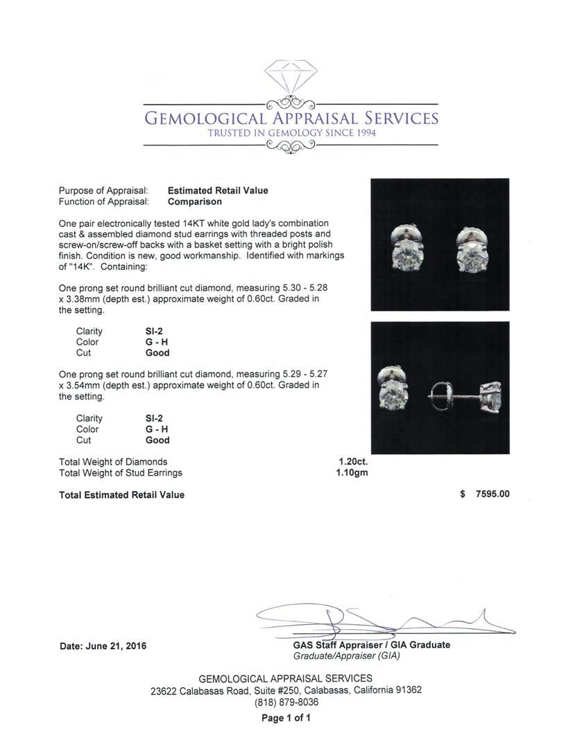 One pair electronically tested 14KT white gold lady's combination cast & assembled diamond stud earrings with threaded posts and screw-on/screw-off backs with a basket setting with a bright polish finish. Identified with markings of "14K". Condition is new, good workmanship. Containing: One prong set round brilliant cut diamond, measuring 5.30 - 5.28 x 3.38mm (depth est.) approximate weight of 0.60ct. Graded in the setting. Clarity: SI-2. Color: G - Good One prong set round brilliant cut diamond, measuring 5.29 - 5.27 x 3.54mm (depth est.) approximate weight of 0.60ct. Graded in the setting. Clarity: SI-2. Color: G - Good. Total Weight of Diamonds 1.20ct. Total Weight of Stud Earrings 1.10gm. GAS Appraised at $7,595.00.