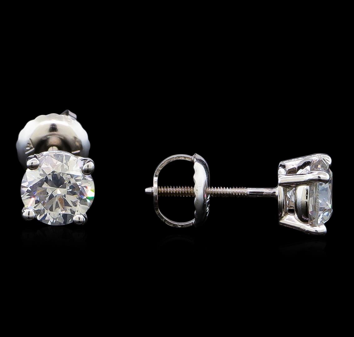 One pair electronically tested 14KT white gold lady's combination cast & assembled diamond stud earrings with threaded posts and screw-on/screw-off backs with a basket setting with a bright polish finish. Identified with markings of "14K". Condition is new, good workmanship. Containing: One prong set round brilliant cut diamond, measuring 5.30 - 5.28 x 3.38mm (depth est.) approximate weight of 0.60ct. Graded in the setting. Clarity: SI-2. Color: G - Good One prong set round brilliant cut diamond, measuring 5.29 - 5.27 x 3.54mm (depth est.) approximate weight of 0.60ct. Graded in the setting. Clarity: SI-2. Color: G - Good. Total Weight of Diamonds 1.20ct. Total Weight of Stud Earrings 1.10gm. GAS Appraised at $7,595.00.