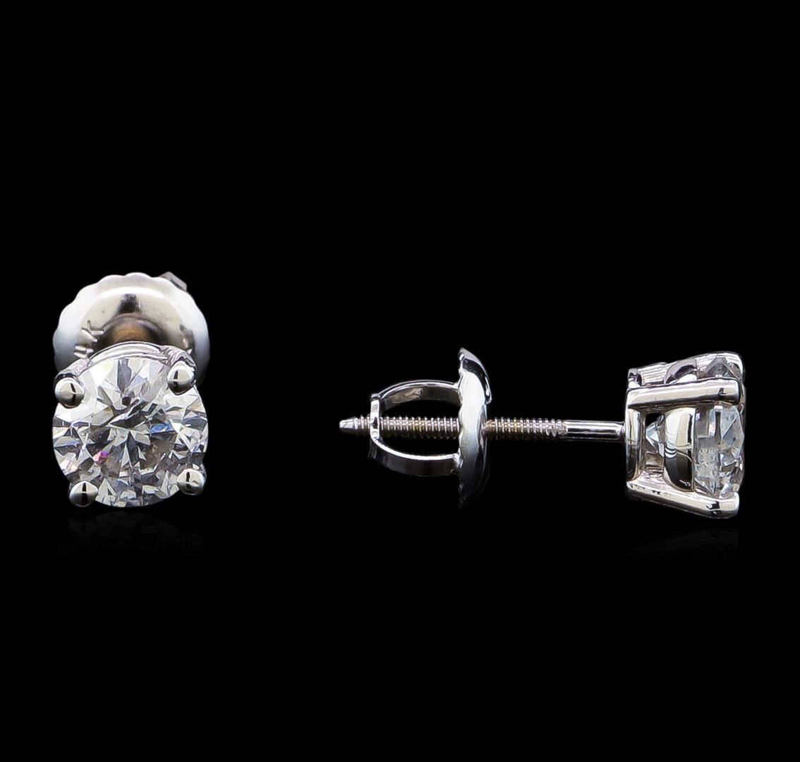 One pair electronically tested 14KT white gold lady's combination cast & assembled diamond stud earrings with threaded posts and screw-on/screw-off backs with a basket setting with a bright polish finish. Identified with markings of "14K". Condition is new, good workmanship. Containing: One prong set round brilliant cut diamond, measuring 5.21 - 5.19 x 3.48mm (depth est.) approximate weight of 0.60ct. Graded in the setting. Clarity: SI-3. Color: Good One prong set round brilliant cut diamond, measuring 5.20 - 5.18 x 3.48mm (depth est.) , 3.00.%. GTCF approximate weight of 0.60ct. Graded in the setting. Clarity: SI-2. Color: Good. Total Weight of Diamonds 1.20ct. Total Weight of Stud Earrings 1.00gm. GAS Appraised at $7,220.00.