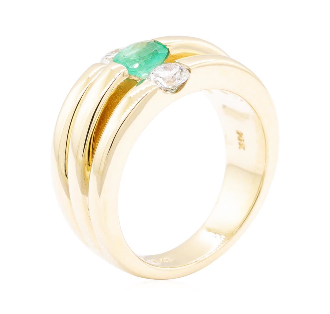 One electronically tested 14KT yellow gold lady's cast fashion three row ring with a tapered domed shank with a bright polish finish. The featured lady's ring has a shank measuring 4.70 millimeters wide. Identified with markings of '14K'. Condition is new, good workmanship. Containing: One channel set round modified mixed cut natural emerald, measuring 5.90 - 4.80 x 3.48 mm, (depth est.) 5%. bulge factor, approximate weight of 0.70ct., clarity is heavily included, medium light, slightly grayish, green color, (GIA G 4/2), cut is good. Transmitting light somewhat diffusely, semi-transparent to translucent. Naturally occurring internal & external characteristics are present. Indications of oil residue. Colored gemstones are presumed to have been subjected to commonly used enhancement processes. Graded in the setting. Two channel set round brilliant cut diamonds, measuring 4.20 - 4.15 x 2.51mm (depth est.) approximate total weight of 2 Stones = 0.50ct. Graded in the setting. Color G - H Clarity SI-2 to I-1 Cut Good. Total Weight of Colored Stones 0.70ct.. Total Weight of Diamonds 0.50ct.. Total Weight of Ring 11.20gm GAS Appraised at $3025.00. GAS Appraised at $3,025.00.