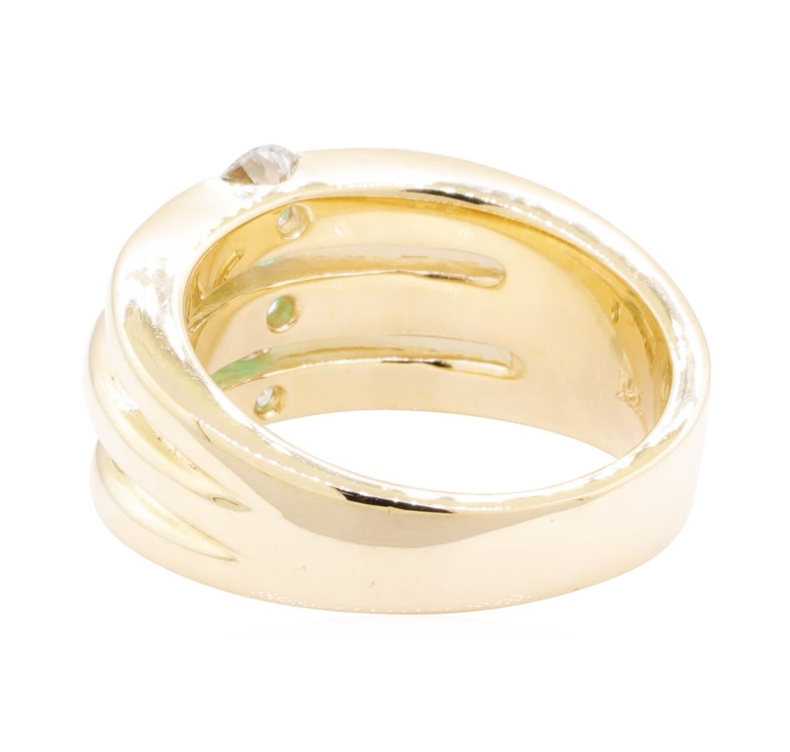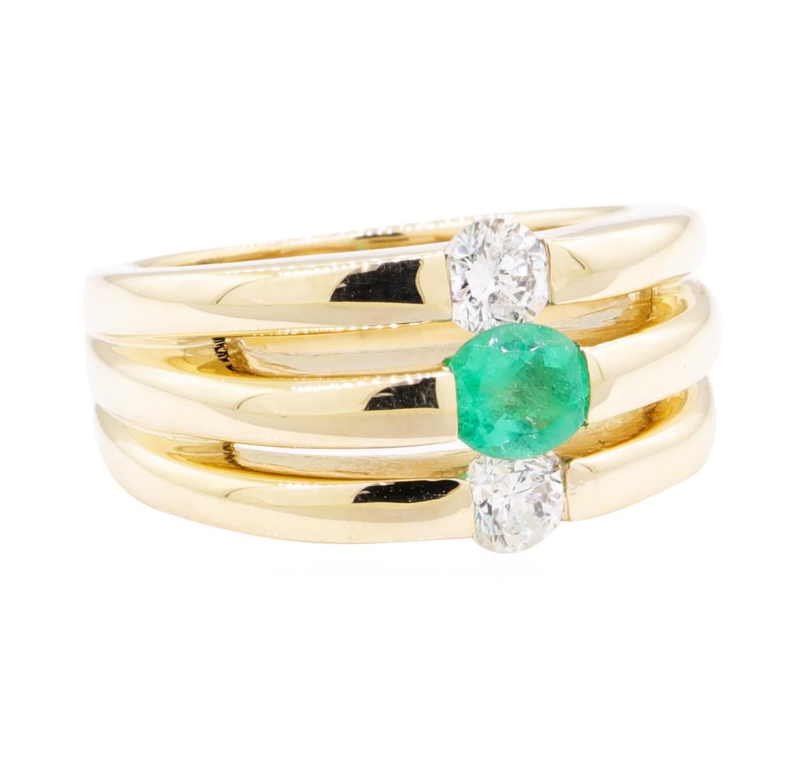 One electronically tested 14KT yellow gold lady's cast fashion three row ring with a tapered domed shank with a bright polish finish. The featured lady's ring has a shank measuring 4.70 millimeters wide. Identified with markings of '14K'. Condition is new, good workmanship. Containing: One channel set round modified mixed cut natural emerald, measuring 5.90 - 4.80 x 3.48 mm, (depth est.) 5%. bulge factor, approximate weight of 0.70ct., clarity is heavily included, medium light, slightly grayish, green color, (GIA G 4/2), cut is good. Transmitting light somewhat diffusely, semi-transparent to translucent. Naturally occurring internal & external characteristics are present. Indications of oil residue. Colored gemstones are presumed to have been subjected to commonly used enhancement processes. Graded in the setting. Two channel set round brilliant cut diamonds, measuring 4.20 - 4.15 x 2.51mm (depth est.) approximate total weight of 2 Stones = 0.50ct. Graded in the setting. Color G - H Clarity SI-2 to I-1 Cut Good. Total Weight of Colored Stones 0.70ct.. Total Weight of Diamonds 0.50ct.. Total Weight of Ring 11.20gm GAS Appraised at $3025.00. GAS Appraised at $3,025.00.