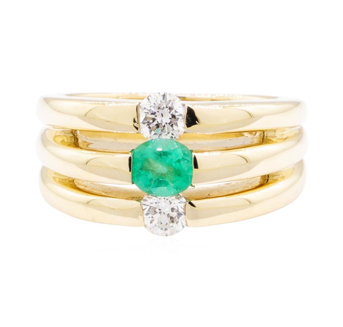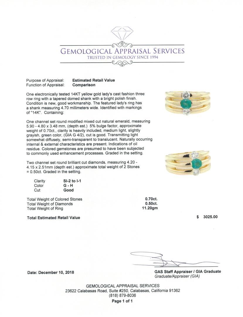 One electronically tested 14KT yellow gold lady's cast fashion three row ring with a tapered domed shank with a bright polish finish. The featured lady's ring has a shank measuring 4.70 millimeters wide. Identified with markings of '14K'. Condition is new, good workmanship. Containing: One channel set round modified mixed cut natural emerald, measuring 5.90 - 4.80 x 3.48 mm, (depth est.) 5%. bulge factor, approximate weight of 0.70ct., clarity is heavily included, medium light, slightly grayish, green color, (GIA G 4/2), cut is good. Transmitting light somewhat diffusely, semi-transparent to translucent. Naturally occurring internal & external characteristics are present. Indications of oil residue. Colored gemstones are presumed to have been subjected to commonly used enhancement processes. Graded in the setting. Two channel set round brilliant cut diamonds, measuring 4.20 - 4.15 x 2.51mm (depth est.) approximate total weight of 2 Stones = 0.50ct. Graded in the setting. Color G - H Clarity SI-2 to I-1 Cut Good. Total Weight of Colored Stones 0.70ct.. Total Weight of Diamonds 0.50ct.. Total Weight of Ring 11.20gm GAS Appraised at $3025.00. GAS Appraised at $3,025.00.