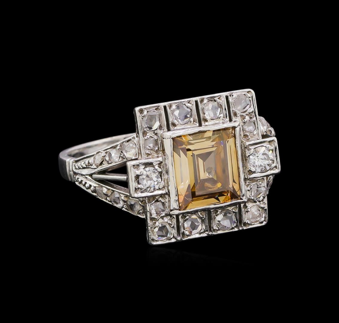 One electronically tested platinum ladies cast diamond and white sapphire ring. The featured diamond is set within a stylized white sapphire bezel with a single diamond accent on either side supported by white sapphire set split shoulders, completed by a one millimeter wide band. Bright finish. Condition is good. Containing: One prong set square cut diamond, measuring 7.00. x 6.10 x 3.20mm (depth est.) approximate weight of 1.10ct with a faint fluorescence. Faint yellow secondary color throughout. Graded in the setting. Clarity: SI-2 . Depth: 52.5%. Table 53.3%. Two prong set single cut diamonds, measuring 2.50 - 2.10 x 1.43mm (depth est.) approximate total weight of 2 Stones = 0.10ct. Graded in the setting. Clarity: I-1 . Color: G - H Twenty-four prong set rose cut natural white sapphires approximate total weight of 0.80ct., clarity is eye clean, colorless, very slightly grayish, white color, (GIA W 0/3), cut is good. Transmitting light with no distortion, transparent. Color grade is an average for the group. Graded in the setting. Total Weight of Colored Stones 0.80ct.. Total Weight of Diamonds 1.20ct.. Total Weight of Ring 4.84gm. AIG Appraised at $9,340.00.