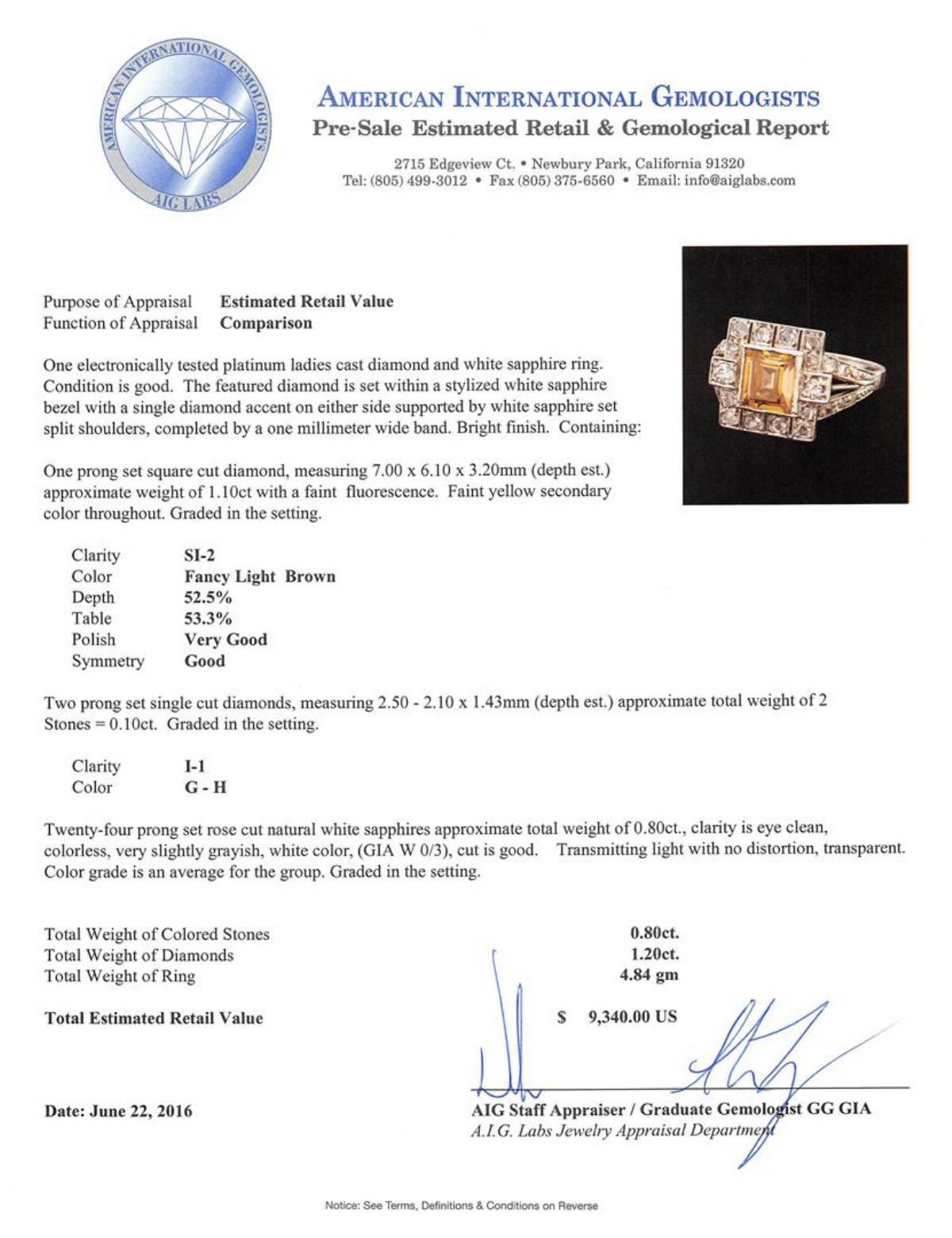 One electronically tested platinum ladies cast diamond and white sapphire ring. The featured diamond is set within a stylized white sapphire bezel with a single diamond accent on either side supported by white sapphire set split shoulders, completed by a one millimeter wide band. Bright finish. Condition is good. Containing: One prong set square cut diamond, measuring 7.00. x 6.10 x 3.20mm (depth est.) approximate weight of 1.10ct with a faint fluorescence. Faint yellow secondary color throughout. Graded in the setting. Clarity: SI-2 . Depth: 52.5%. Table 53.3%. Two prong set single cut diamonds, measuring 2.50 - 2.10 x 1.43mm (depth est.) approximate total weight of 2 Stones = 0.10ct. Graded in the setting. Clarity: I-1 . Color: G - H Twenty-four prong set rose cut natural white sapphires approximate total weight of 0.80ct., clarity is eye clean, colorless, very slightly grayish, white color, (GIA W 0/3), cut is good. Transmitting light with no distortion, transparent. Color grade is an average for the group. Graded in the setting. Total Weight of Colored Stones 0.80ct.. Total Weight of Diamonds 1.20ct.. Total Weight of Ring 4.84gm. AIG Appraised.