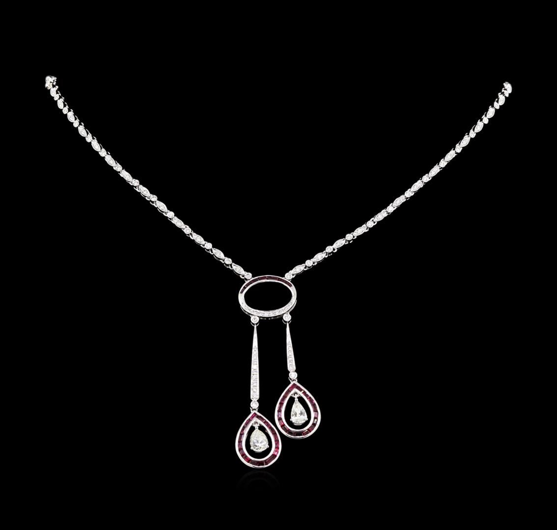 One electronically tested 18KT white gold lady's combination cast & assembled fashion necklace with a tongue clasp with foldover safety with a bright polish finish. The featured lady's necklace measures 16 inches in length. Identified with markings of "18K". Condition is new, good workmanship. Containing: Forty channel set baguette step cut natural rubies, measuring 2.80 x 1.30 x 0.75mm, approximate total weight of 1.20ct., clarity is eye clean, type II, medium dark, moderately strong, orangy red color, (GIA oR 6/4), cut is very good. Colored gemstones are presumed to have been subjected to commonly used enhancement processes. Graded in the setting. Two prong set pear shaped cut diamonds, measuring 7.15 x 4.40 x 2.95mm (depth est.) approximate total weight of 2 Stones = 1.10ct. Graded in the setting. Clarity: SI-1 to I-1. Color: I - Good Thirty-One prong set round brilliant cut diamonds, measuring 1.60 - 1.30 x 0.90mm (depth est.) approximate total weight of 31 Stones = 0.36ct. Graded in the setting. Clarity: VS-2 to SI-1. Color: G - Very Good One Hundred Fifteen bezel set round brilliant cut diamonds, measuring 1.60 - 1.50 x 0.96mm (depth est.) approximate total weight of 115 Stones = 1.61ct. Graded in the setting. Clarity: VS-2 to SI-1. Color: H - I. Cut Very Good. Total Weight of Colored Stones 1.20ct. Total Weight of Diamonds 3.07ct. Total Weight of Necklace 21.10gm. GAS Appraised at $18,510.00.