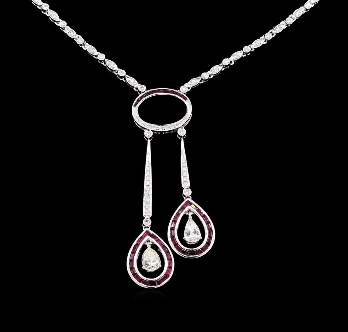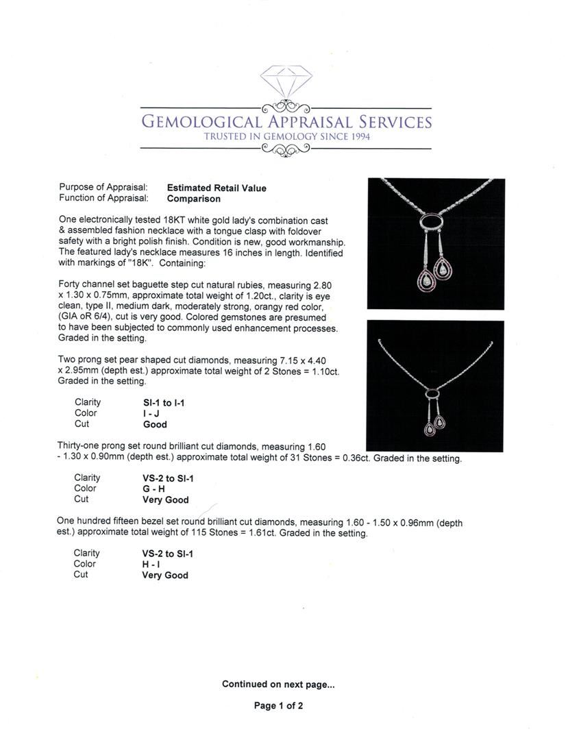 One electronically tested 18KT white gold lady's combination cast & assembled fashion necklace with a tongue clasp with foldover safety with a bright polish finish. The featured lady's necklace measures 16 inches in length. Identified with markings of "18K". Condition is new, good workmanship. Containing: Forty channel set baguette step cut natural rubies, measuring 2.80 x 1.30 x 0.75mm, approximate total weight of 1.20ct., clarity is eye clean, type II, medium dark, moderately strong, orangy red color, (GIA oR 6/4), cut is very good. Colored gemstones are presumed to have been subjected to commonly used enhancement processes. Graded in the setting. Two prong set pear shaped cut diamonds, measuring 7.15 x 4.40 x 2.95mm (depth est.) approximate total weight of 2 Stones = 1.10ct. Graded in the setting. Clarity: SI-1 to I-1. Color: I - Good Thirty-One prong set round brilliant cut diamonds, measuring 1.60 - 1.30 x 0.90mm (depth est.) approximate total weight of 31 Stones = 0.36ct. Graded in the setting. Clarity: VS-2 to SI-1. Color: G - Very Good One Hundred Fifteen bezel set round brilliant cut diamonds, measuring 1.60 - 1.50 x 0.96mm (depth est.) approximate total weight of 115 Stones = 1.61ct. Graded in the setting. Clarity: VS-2 to SI-1. Color: H - I. Cut Very Good. Total Weight of Colored Stones 1.20ct. Total Weight of Diamonds 3.07ct. Total Weight of Necklace 21.10gm. GAS Appraised at $18,510.00.