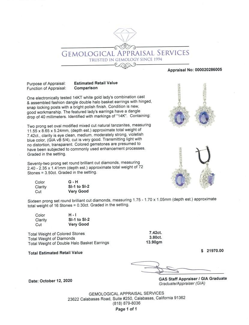 One electronically tested 14KT white gold lady's combination cast & assembled fashion dangle double halo basket earrings with hinged, snap locking posts with a bright polish finish. The featured lady's earrings have a dangle drop of 40 millimeters. Identified with markings of '14K'. Condition is new, good workmanship. Containing: Two prong set oval modified mixed cut natural tanzanites, measuring 11.55 x 8.65 x 5.24mm, (depth est.) approximate total weight of 7.42ct., clarity is eye clean, medium, moderately strong, violetish blue color, (GIA vB 5/4), cut is very good. Transmitting light with no distortion, transparent. Colored gemstones are presumed to have been subjected to commonly used enhancement processes. Graded in the setting. Seventy-Two prong set round brilliant cut diamonds, measuring 2.40 - 2.35 x 1.41mm (depth est.) approximate total weight of 72 Stones = 3.50ct. Graded in the setting. Color G - H Clarity SI-1 to SI-2 Cut Very Good Sixteen prong set round brilliant cut diamonds, measuring 1.75 - 1.70 x 1.05mm (depth est.) approximate total weight of 16 Stones = 0.30ct. Graded in the setting. Color H - I Clarity SI-1 to SI-2 Cut Very Good. Total Weight of Colored Stones 7.42ct.. Total Weight of Diamonds 3.80ct.. Total Weight of Double Halo Basket Earrings 13.90gm GAS Appraised at $21970.00. GAS Appraised.