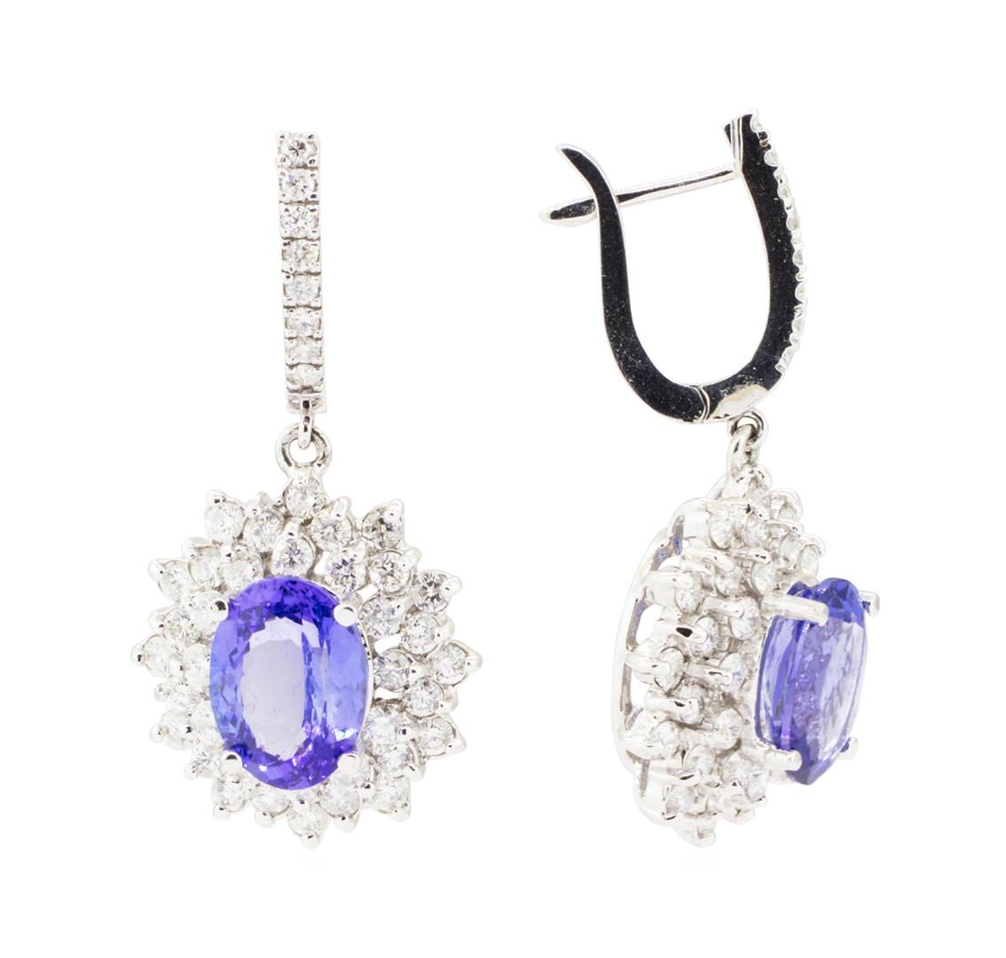 One electronically tested 14KT white gold lady's combination cast & assembled fashion dangle double halo basket earrings with hinged, snap locking posts with a bright polish finish. The featured lady's earrings have a dangle drop of 40 millimeters. Identified with markings of '14K'. Condition is new, good workmanship. Containing: Two prong set oval modified mixed cut natural tanzanites, measuring 11.55 x 8.65 x 5.24mm, (depth est.) approximate total weight of 7.42ct., clarity is eye clean, medium, moderately strong, violetish blue color, (GIA vB 5/4), cut is very good. Transmitting light with no distortion, transparent. Colored gemstones are presumed to have been subjected to commonly used enhancement processes. Graded in the setting. Seventy-Two prong set round brilliant cut diamonds, measuring 2.40 - 2.35 x 1.41mm (depth est.) approximate total weight of 72 Stones = 3.50ct. Graded in the setting. Color G - H Clarity SI-1 to SI-2 Cut Very Good Sixteen prong set round brilliant cut diamonds, measuring 1.75 - 1.70 x 1.05mm (depth est.) approximate total weight of 16 Stones = 0.30ct. Graded in the setting. Color H - I Clarity SI-1 to SI-2 Cut Very Good. Total Weight of Colored Stones 7.42ct.. Total Weight of Diamonds 3.80ct.. Total Weight of Double Halo Basket Earrings 13.90gm GAS Appraised at $21970.00. GAS Appraised.