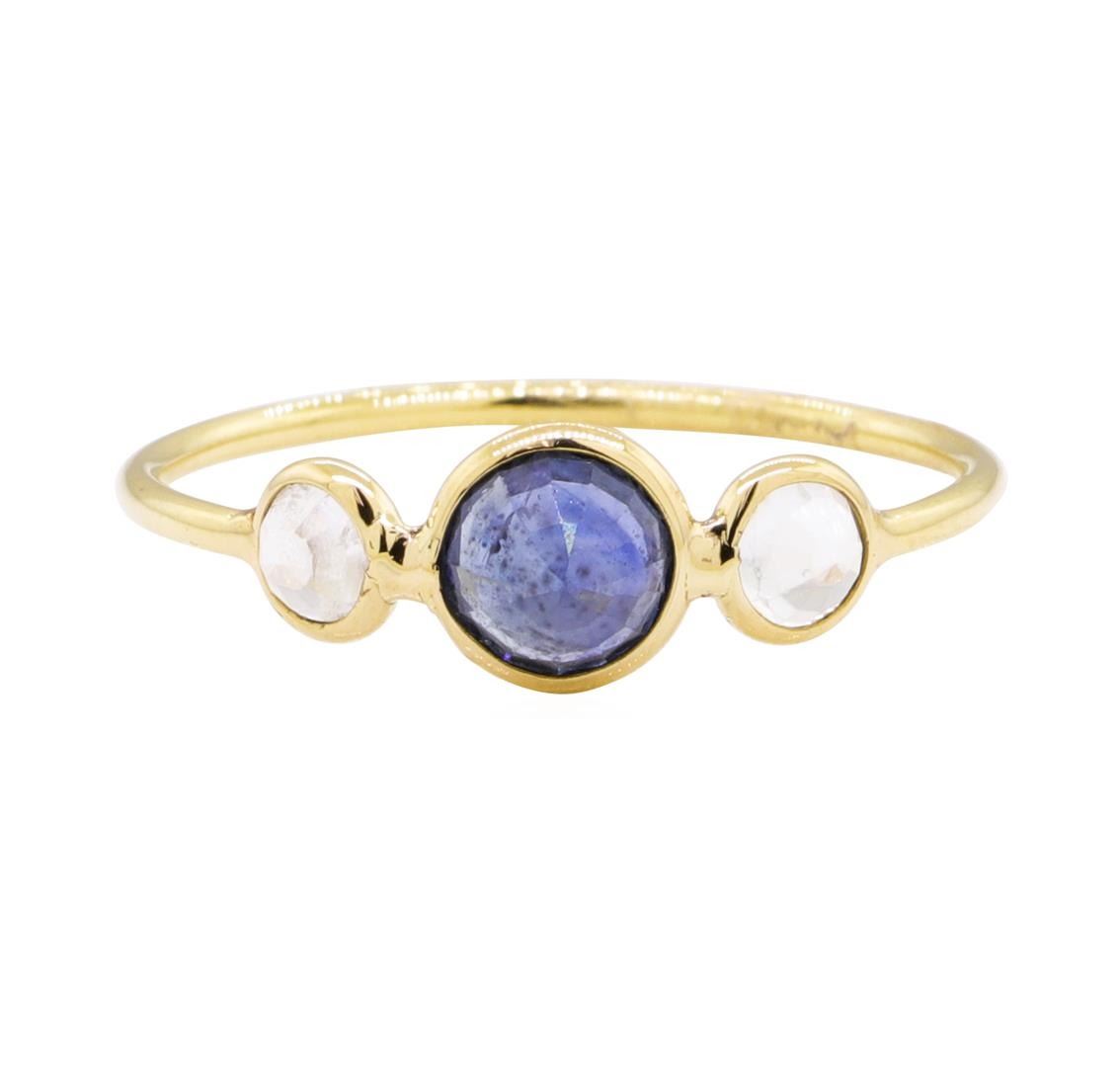 One ring featuring: 18KT yellow gold weighing 1.0 grams containing one sapphire weighing 0.80 ct and two moonstones weighing 0.40 ctw.