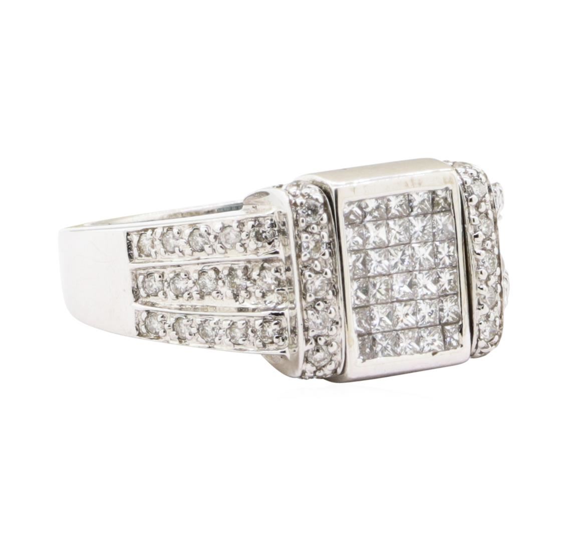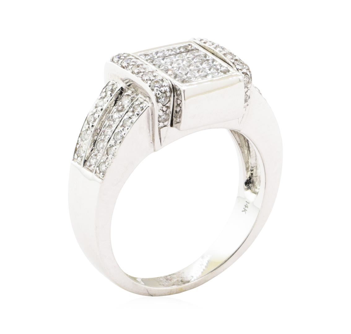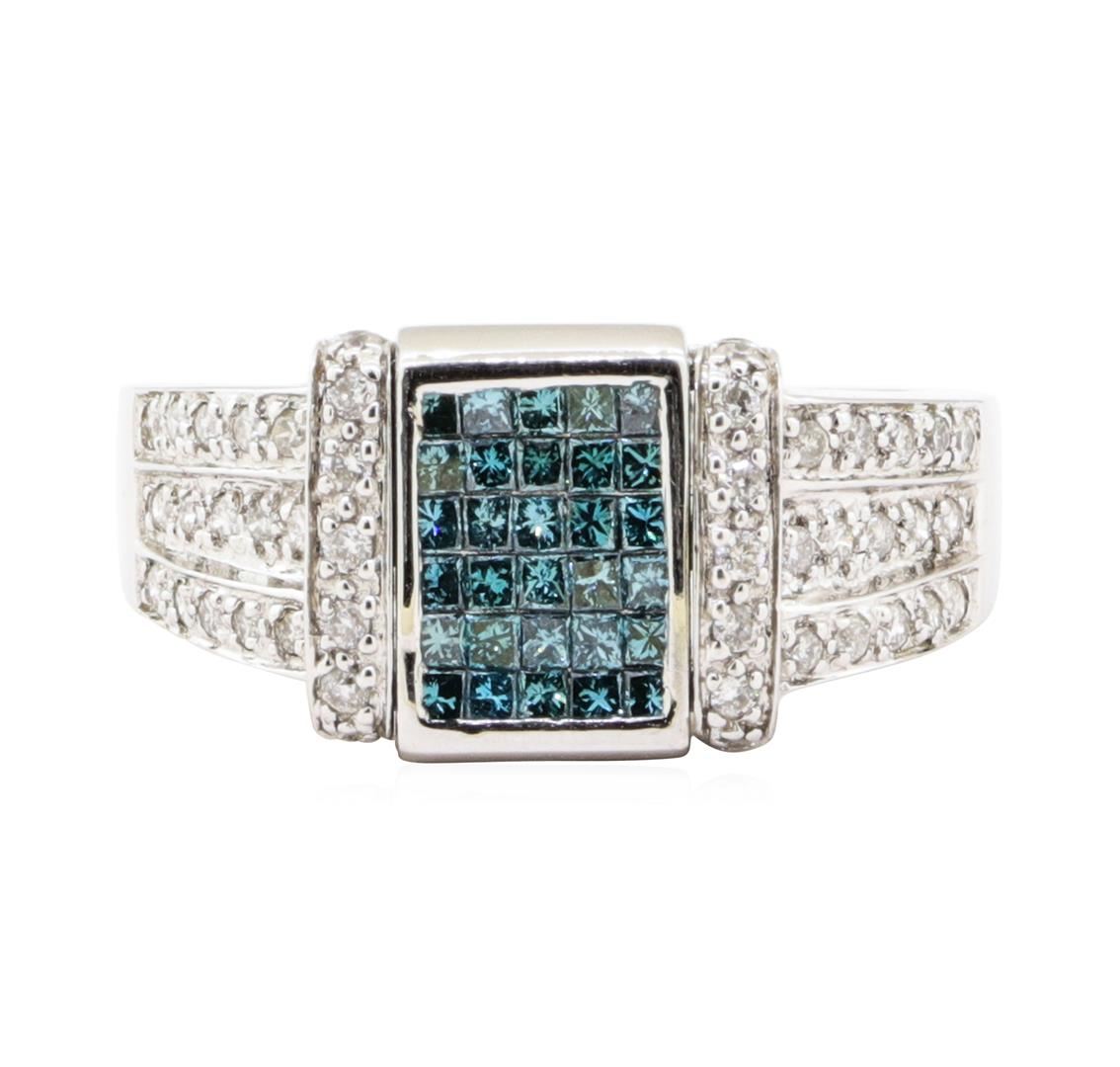 One electronically tested 14KT white gold lady's combination cast & assembled fashion ring with a reversible top with a bright polish finish. The featured lady's ring has a shank measuring 3.00 millimeters wide. Identified with markings of '14K'. Condition is new, good workmanship. Containing: Thirty invisible set princess cut treated diamonds, measuring 1.40 x 1.40 x 1.05mm (depth est.) approximate total weight of 30 Stones = 0.44ct. Colored gemstones are presumed to have been subjected to commonly used enhancement processes. Graded in the setting. Color Fancy Greenish Blue Clarity VS-2 to SI-1 Cut Very Good Thirty invisible set princess cut diamonds, measuring 1.40 x 1.40 x 1.05mm (depth est.) approximate total weight of 30 Stones = 0.43ct. Graded in the setting. Color H - I Clarity VS-2 to SI-1 Cut Very Good Forty-Eight prong set round brilliant cut diamonds, measuring 1.30 - 1.20 x 0.75mm (depth est.) approximate total weight of 48 Stones = 0.33ct. Graded in the setting. Color H - I Clarity SI-2 to I-1 Cut Good. Total Weight of Diamonds 1.20 ct.. Total Weight of Ring 7.90gm GAS Appraised at $5420.00. GAS Appraised.