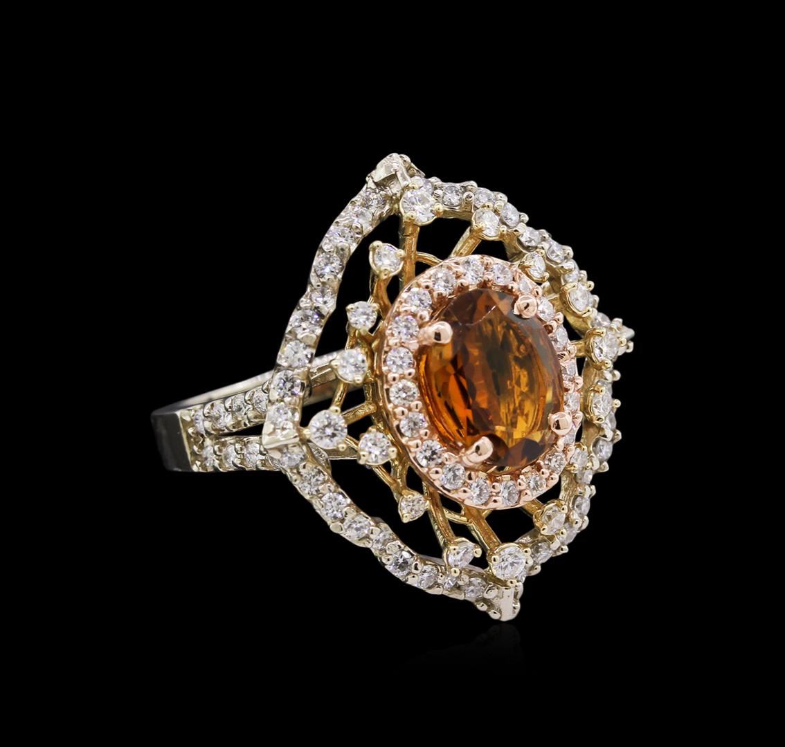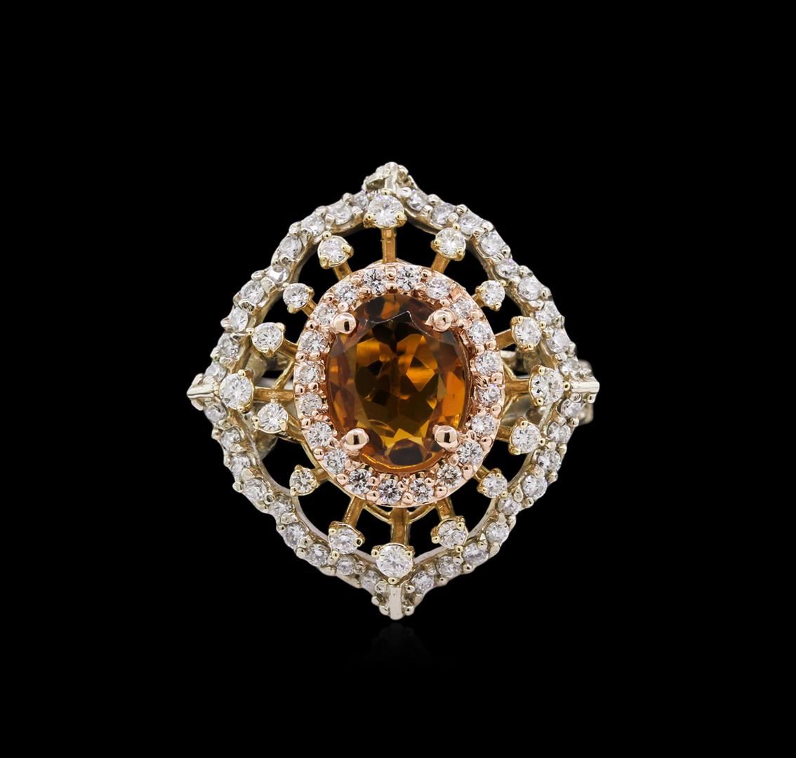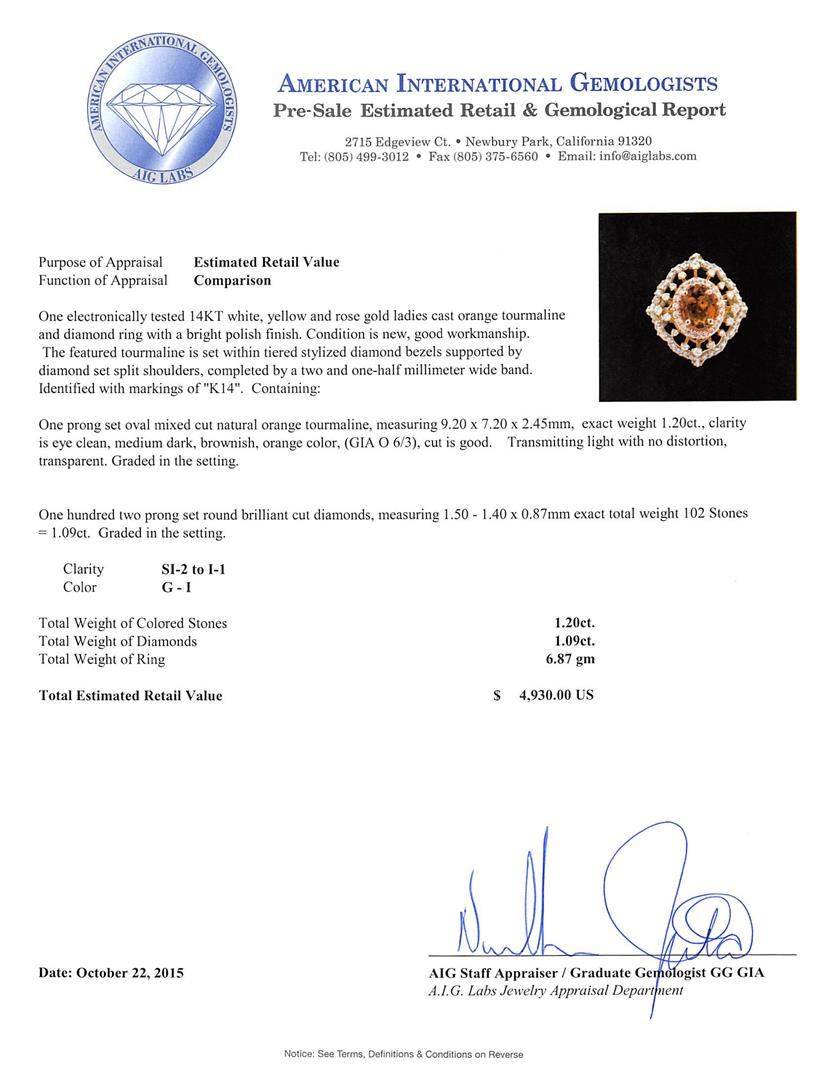 One electronically tested 14KT white, yellow and rose gold ladies cast orange tourmaline and diamond ring with a bright polish finish. The featured tourmaline is set within tiered stylized diamond bezels supported by diamond set split shoulders, completed by a two and one-half millimeter wide band. Identified with markings of "K14". Condition is new, good workmanship. Containing: One prong set oval mixed cut natural orange tourmaline, measuring 9.20 x 7.20 x 2.45mm, exact weight 1.20ct., clarity is eye clean, medium dark, brownish, orange color, (GIA O 6/3), cut is good. Transmitting light with no distortion, transparent. Graded in the setting. One Hundred Two prong set round brilliant cut diamonds, measuring 1.50 - 1.40 x 0.87mm exact total weight 102 Stones = 1.09ct. Graded in the setting. Clarity: SI-2 to I-1. Color: G - I. Total Weight of Colored Stones 1.20ct. Total Weight of Diamonds 1.09ct. Total Weight of Ring 6.87gm. AIG Appraised at $4,930.00.