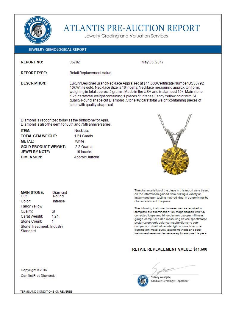 1.21 CTW Certified Intense Yellow SI Diamond Solitaire Necklace 10K White Gold ---- Luxury Designer Brand Necklace Appraised Retail Price at $11,600 ---- SKU Number US36792 10k White gold Necklace Size is 16 Incehs, Necklace measuring approx. Uniform, weighing in total approx. 2 grams. Made in the USA and is stamped 10k, Main stone 1.21 carat total weight containing 1 pieces of Intense Fancy Yellow color with SI quality Round shape cut Diamond , Stone #2 carat total weight containing pieces of color with quality shape cut