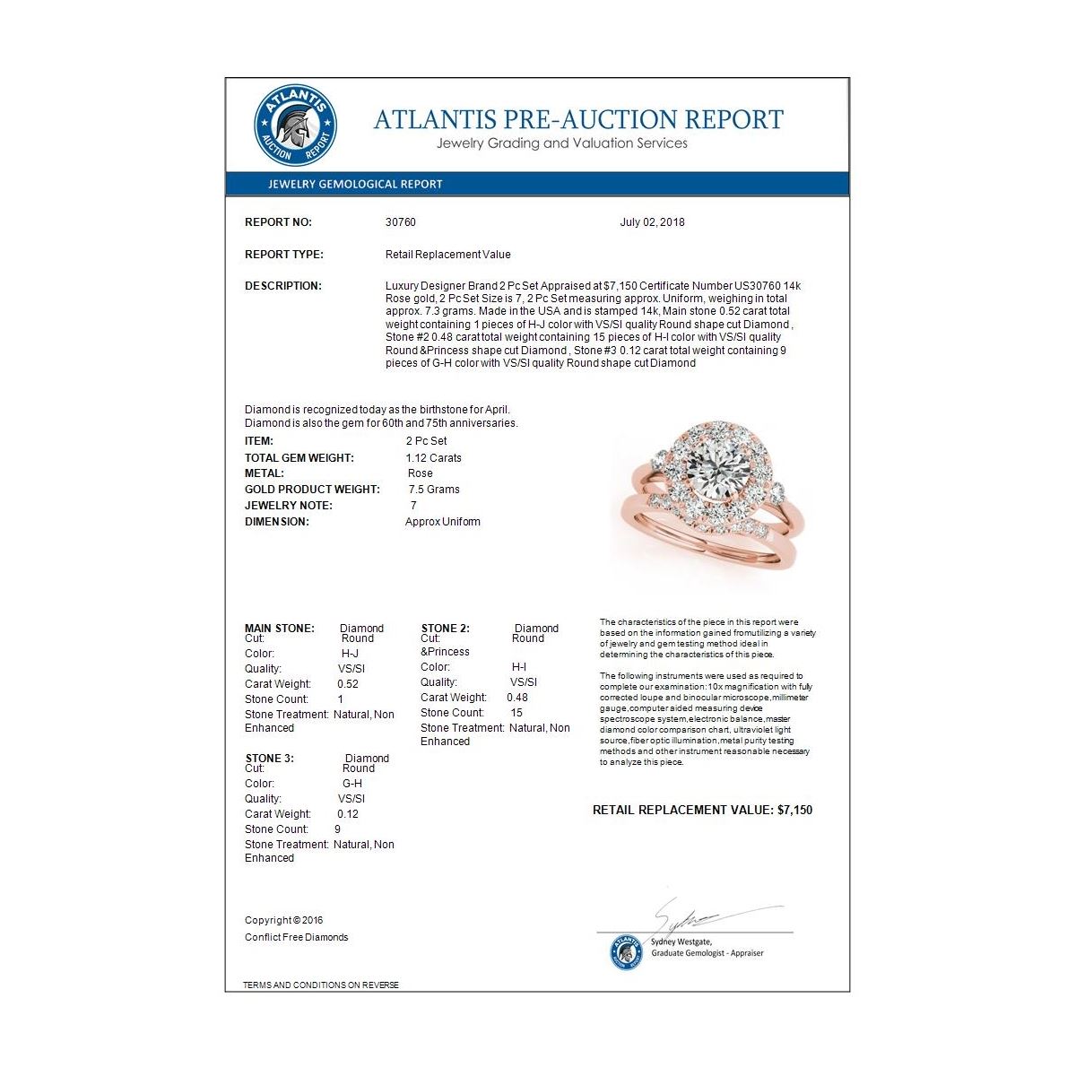 REF-144W9F -30760 ---- 1.21 CTW Certified VS/SI Diamond 2Pc Wedding Set Solitaire Halo 14K Rose Gold ---- Luxury Designer Brand 2 Pc Set Appraised at $7,150 Certificate Number US30760 14k Rose gold, 2 Pc Set Size is 7, 2 Pc Set measuring approx. Uniform, weighing in total approx. 7.3 grams. Made in the USA and is stamped 14k, Main stone 0.52 carat total weight containing 1 pieces of H-J color with VS/SI quality Round shape cut Diamond , Stone #2 0.48 carat total weight containing 15 pieces of H-I color with VS/SI quality Round &Princess shape cut Diamond , Stone #3 0.12 carat total weight containing 9 pieces of G-H color with VS/SI quality Round shape cut Diamond