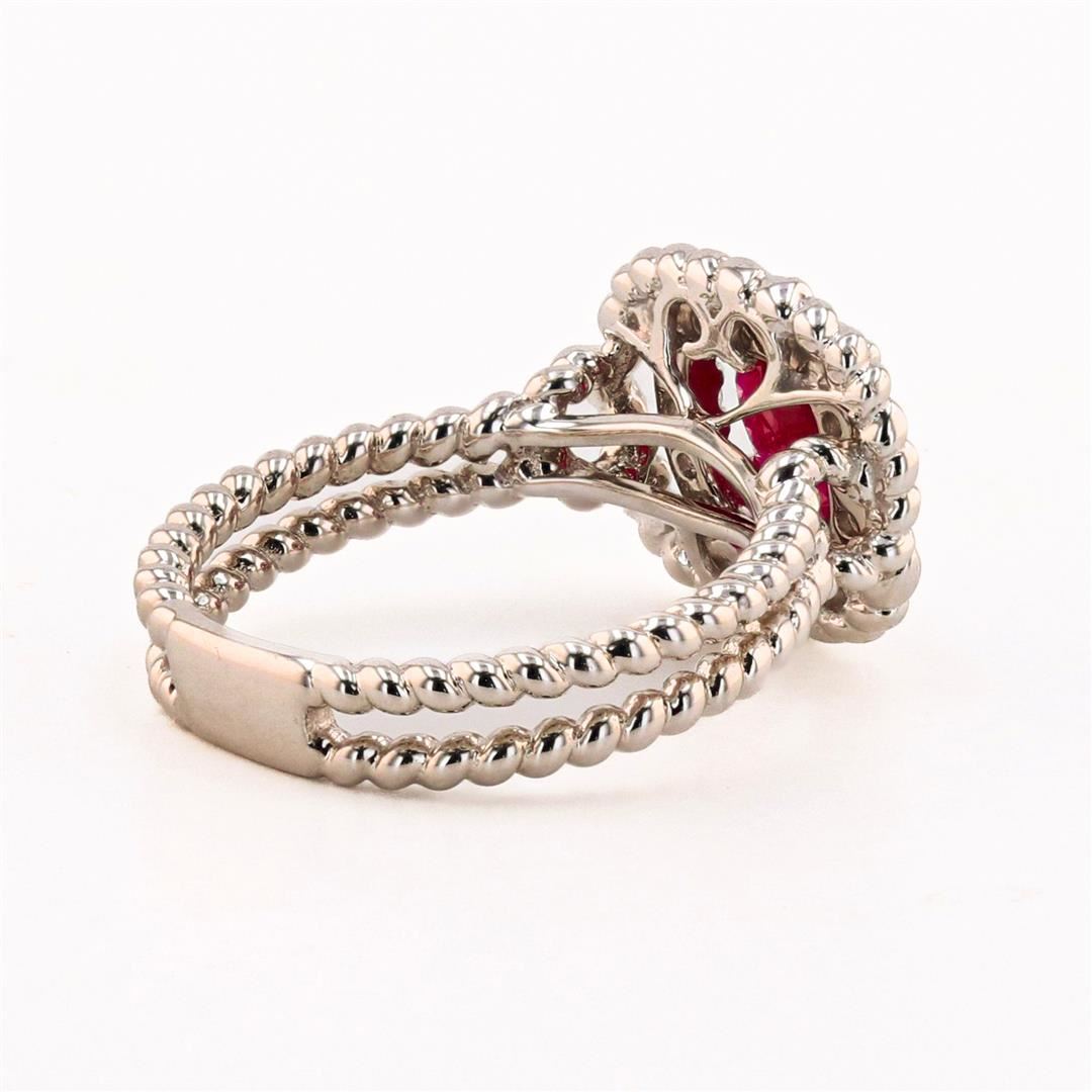 Eighteen karat (18K) white gold natural burmese ruby corundum and diamond ring. An oval brilliant cut natural burmese ruby corundum gemstone is mounted in the center of the ring. Round brilliant cut diamonds accent the ring around the center gemstone. The