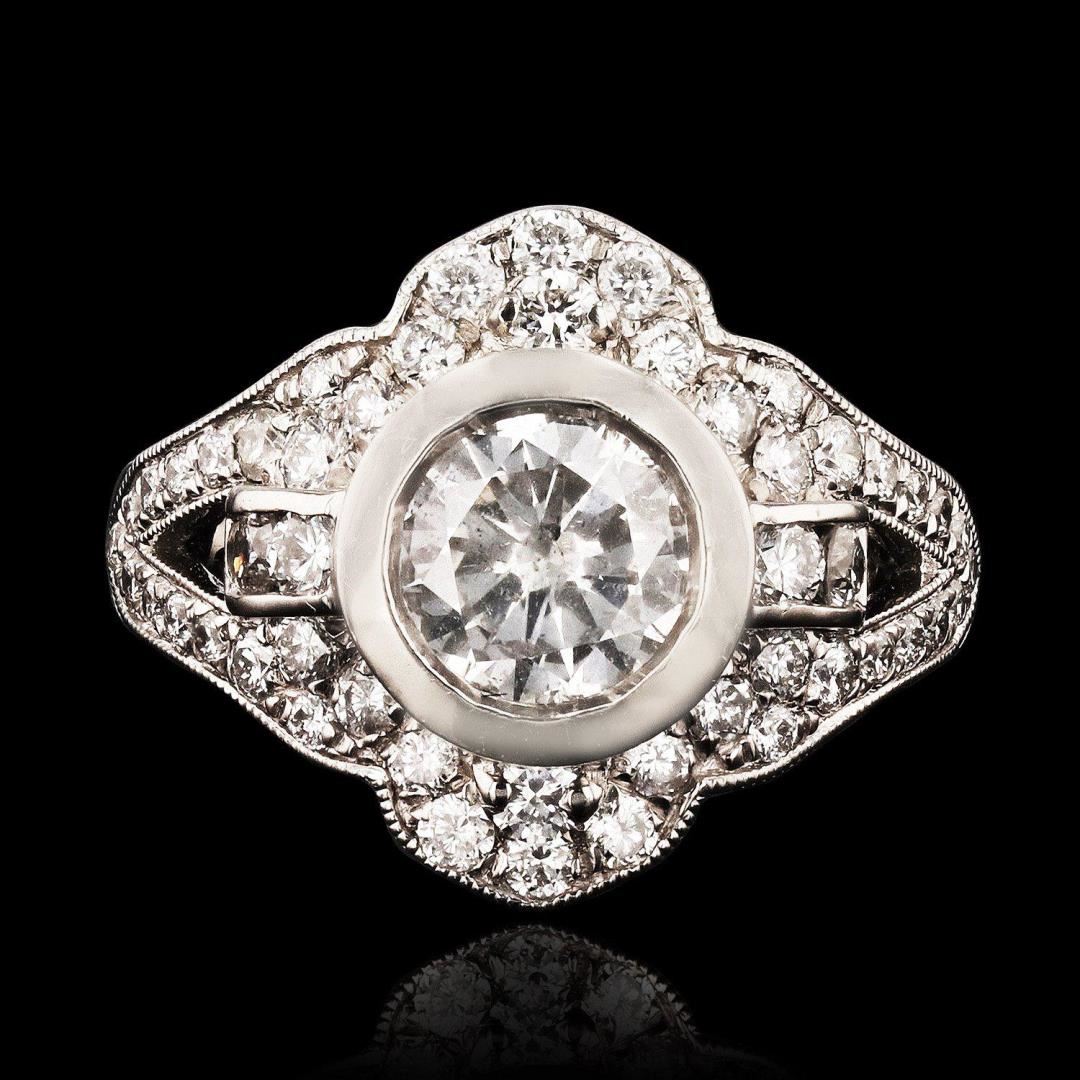 One electronically tested platinum ladies cast diamond ring. Condition is new, good workmanship. The featured diamond is set within a stylized diamond gallery, supported by an elaborate lattice under gallery and diamond set shoulders, completed by a three millimeter wide band. Bright polish finish with Mil grain detailing throughout. Trademark is Orianne. Identified with markings of "PT950" Containing: One bezel set round brilliant cut diamond, measuring 7.00 - 7.00 x 4.20mm (depth est.) approximate weight of 1.21ct. Graded in the setting. Clarity I1 Color G Depth 60.0% Table 62.9% Fifty bead set round brilliant cut diamonds, measuring 2.30 - 1.40 x 1.11mm (depth est.) approximate total weight of 50 Stones = 1.08ctw. Graded in the setting. Clarity SI1 to I1 Color E - G Total Weight of Diamonds 2.29ctw. Total Weight of Ring 11.50 gm