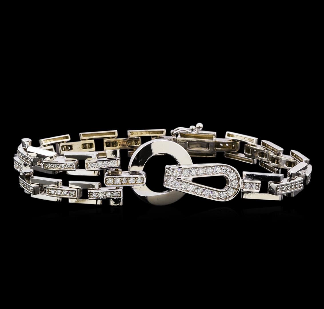 One electronically tested 14KT white gold lady's combination cast & assembled fashion link bracelet with a tongue clasp with foldover safety with a bright polish finish. The featured lady's link bracelet measures 7 inches in length. Identified with markings of "K14". Condition is new, good workmanship. Containing: Nineteen prong set round brilliant cut diamonds, measuring 1.80 - 1.70 x 1.05mm (depth est.) approximate total weight of 19 Stones = 0.36ct. Graded in the setting. Clarity: SI-1 to SI-2. Color: G - Good Eighty-Six prong set round brilliant cut diamonds, measuring 1.40 - 1.35 x 0.83mm (depth est.) approximate total weight of 86 Stones = 0.85ct. Graded in the setting. Clarity: SI-1 to SI-2. Color: G - I. Cut Good. Total Weight of Diamonds 1.21ct. Total Weight of Link Bracelet 20.40gm. GAS Appraised at $5,955.00.