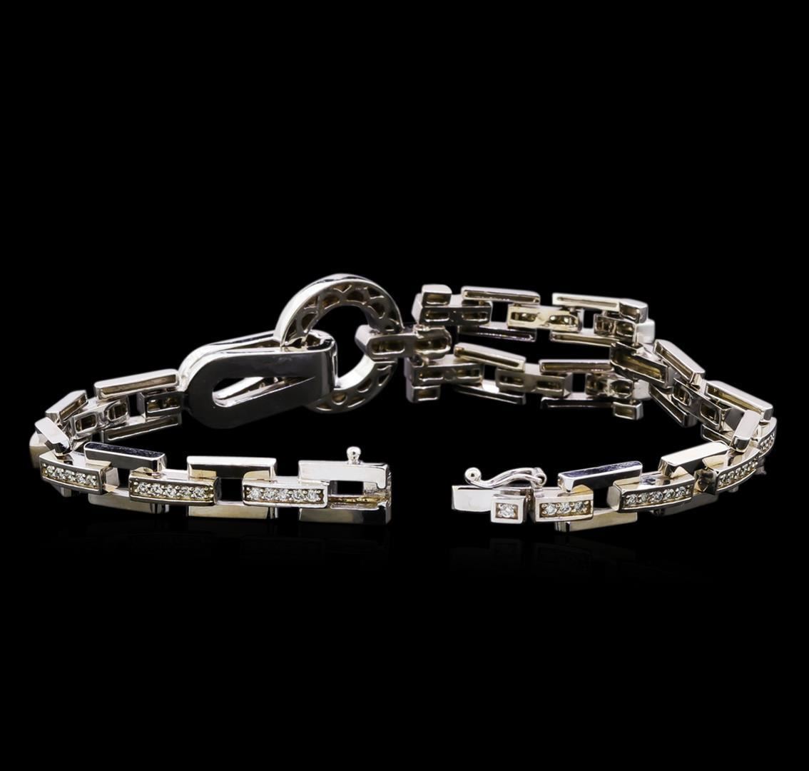 One electronically tested 14KT white gold lady's combination cast & assembled fashion link bracelet with a tongue clasp with foldover safety with a bright polish finish. The featured lady's link bracelet measures 7 inches in length. Identified with markings of "K14". Condition is new, good workmanship. Containing: Nineteen prong set round brilliant cut diamonds, measuring 1.80 - 1.70 x 1.05mm (depth est.) approximate total weight of 19 Stones = 0.36ct. Graded in the setting. Clarity: SI-1 to SI-2. Color: G - Good Eighty-Six prong set round brilliant cut diamonds, measuring 1.40 - 1.35 x 0.83mm (depth est.) approximate total weight of 86 Stones = 0.85ct. Graded in the setting. Clarity: SI-1 to SI-2. Color: G - I. Cut Good. Total Weight of Diamonds 1.21ct. Total Weight of Link Bracelet 20.40gm. GAS Appraised.