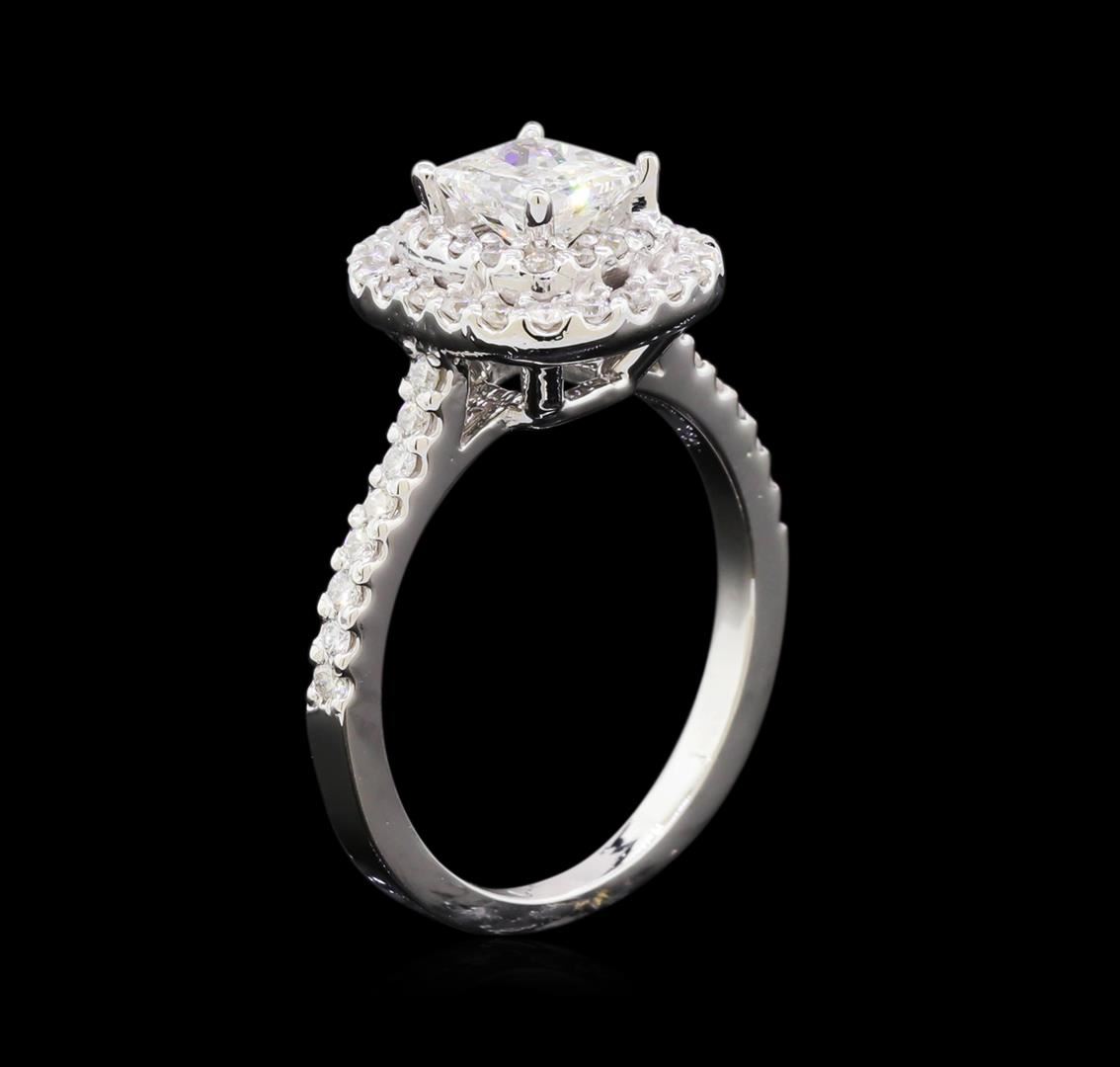 One electronically tested 14KT white gold lady's cast wedding ring with a double basket halo with a bright polish finish. The featured lady's ring has a shank measuring 1.73 millimeters wide. Identified with markings of "14K". Condition is new, good workmanship. Containing: One prong set princess rectangular cut diamond, measuring 5.29 x 4.64 x 3.35mm (depth est.) approximate weight of 0.74ct. Graded in the setting. Clarity: I-1. Color: G - Very Good Thirty-Eight prong set round brilliant cut diamonds, measuring 1.40 - 1.30 x 0.84mm (depth est.) approximate total weight of 38 Stones = 0.37ct. Graded in the setting. Clarity: SI-1 to I-1. Color: G - I. Cut Good Sixteen prong set round brilliant cut diamonds, measuring 1.20 - 1.15 x 0.73mm (depth est.) approximate total weight of 16 Stones = 0.10ct. Graded in the setting. Clarity: SI-1 to I-1. Color: G - I. Cut Good. Total Weight of Diamonds 1.21ct. Total Weight of Ring 4.40gm. GAS Appraised at $5,260.00.
