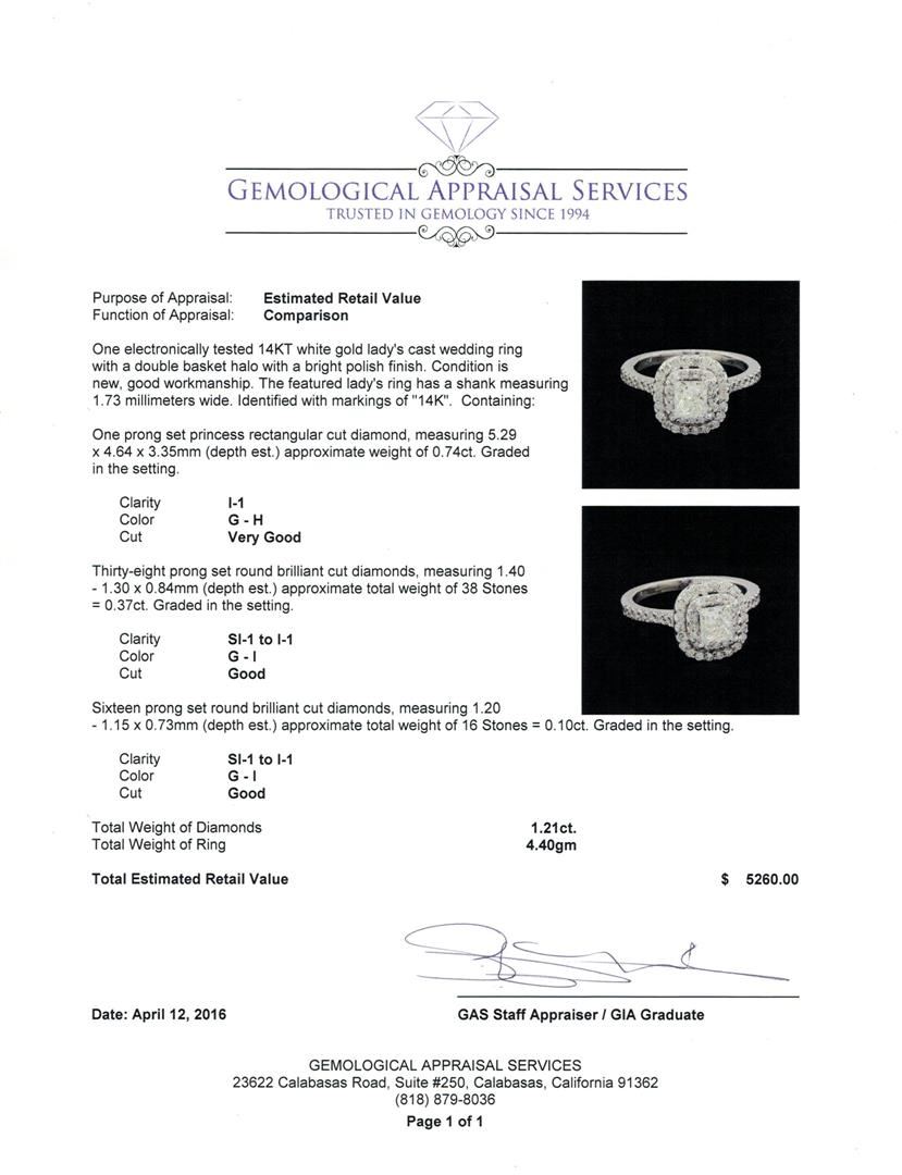 One electronically tested 14KT white gold lady's cast wedding ring with a double basket halo with a bright polish finish. The featured lady's ring has a shank measuring 1.73 millimeters wide. Identified with markings of "14K". Condition is new, good workmanship. Containing: One prong set princess rectangular cut diamond, measuring 5.29 x 4.64 x 3.35mm (depth est.) approximate weight of 0.74ct. Graded in the setting. Clarity: I-1. Color: G - Very Good Thirty-Eight prong set round brilliant cut diamonds, measuring 1.40 - 1.30 x 0.84mm (depth est.) approximate total weight of 38 Stones = 0.37ct. Graded in the setting. Clarity: SI-1 to I-1. Color: G - I. Cut Good Sixteen prong set round brilliant cut diamonds, measuring 1.20 - 1.15 x 0.73mm (depth est.) approximate total weight of 16 Stones = 0.10ct. Graded in the setting. Clarity: SI-1 to I-1. Color: G - I. Cut Good. Total Weight of Diamonds 1.21ct. Total Weight of Ring 4.40gm. GAS Appraised at $5,260.00.