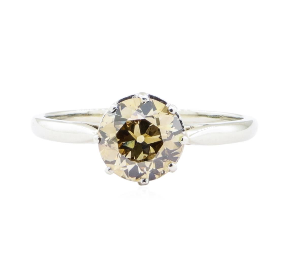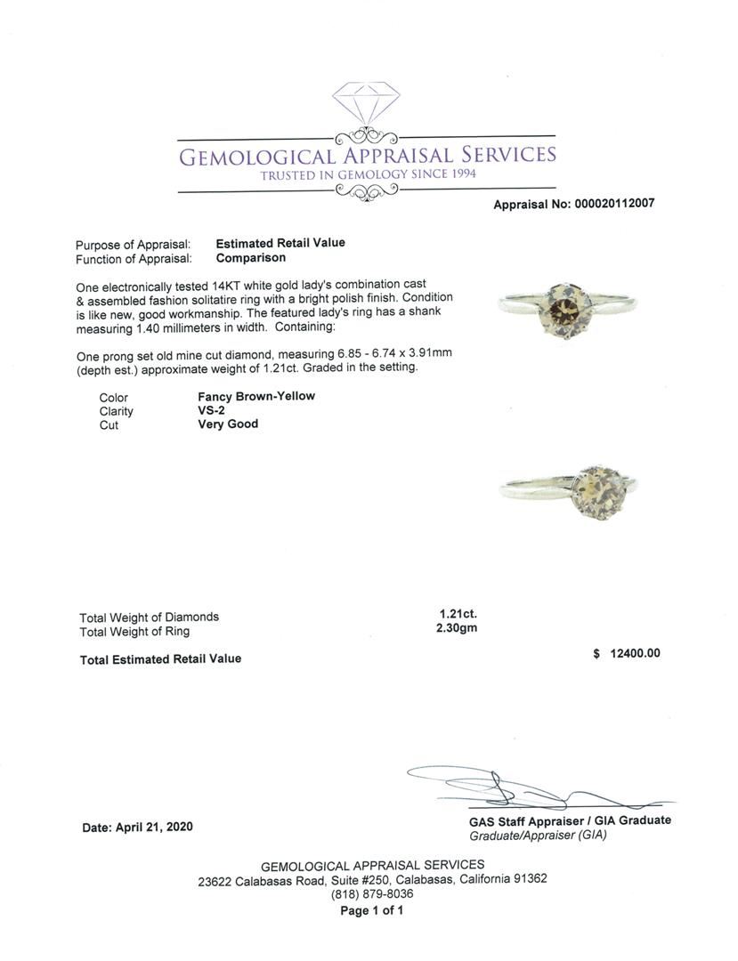 One electronically tested 14KT white gold lady's combination cast & assembled fashion solitatire ring with a bright polish finish. The featured lady's ring has a shank measuring 1.40 millimeters in width. Condition is Good. Containing: One prong set old m GAS Appraised.