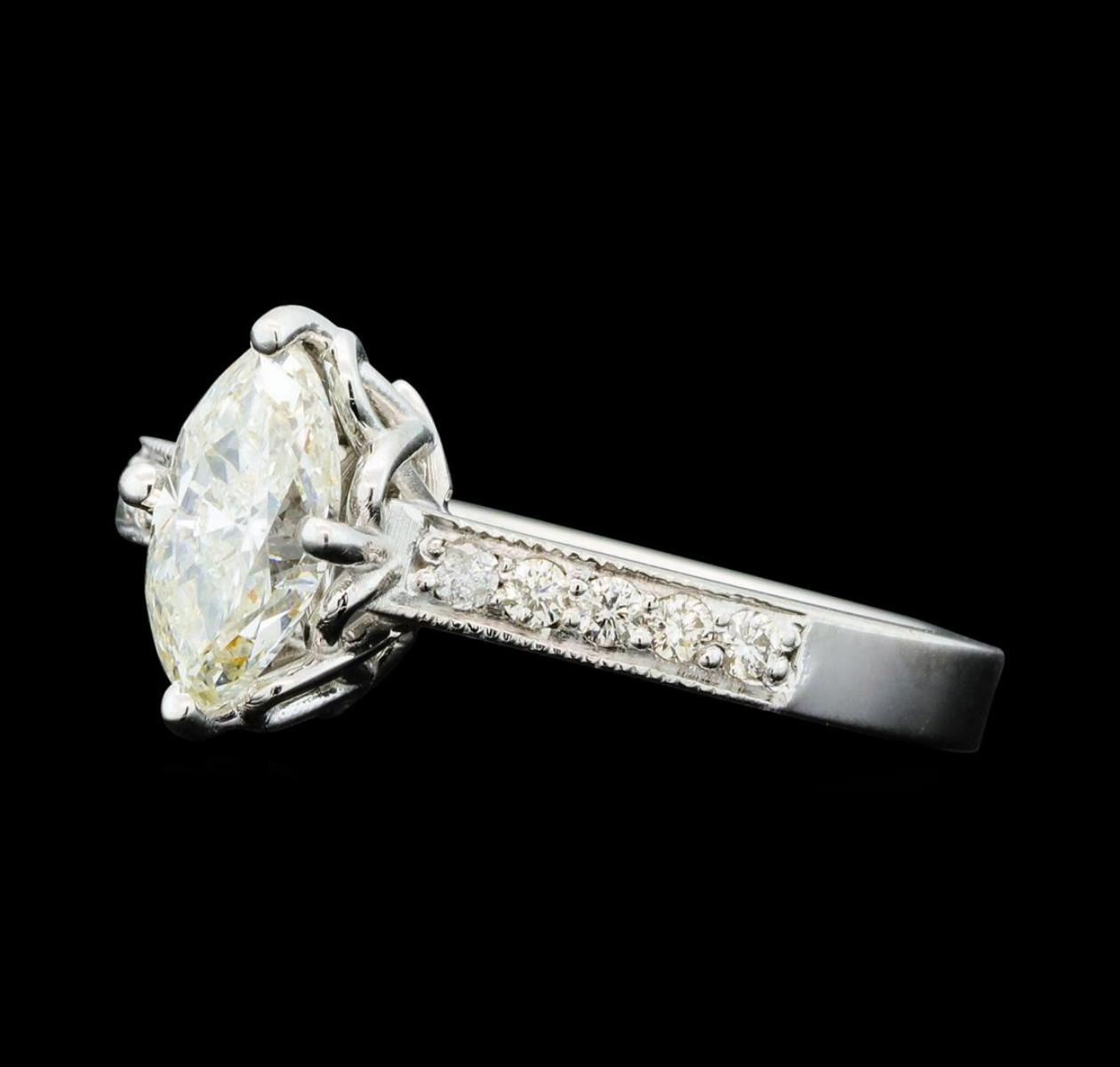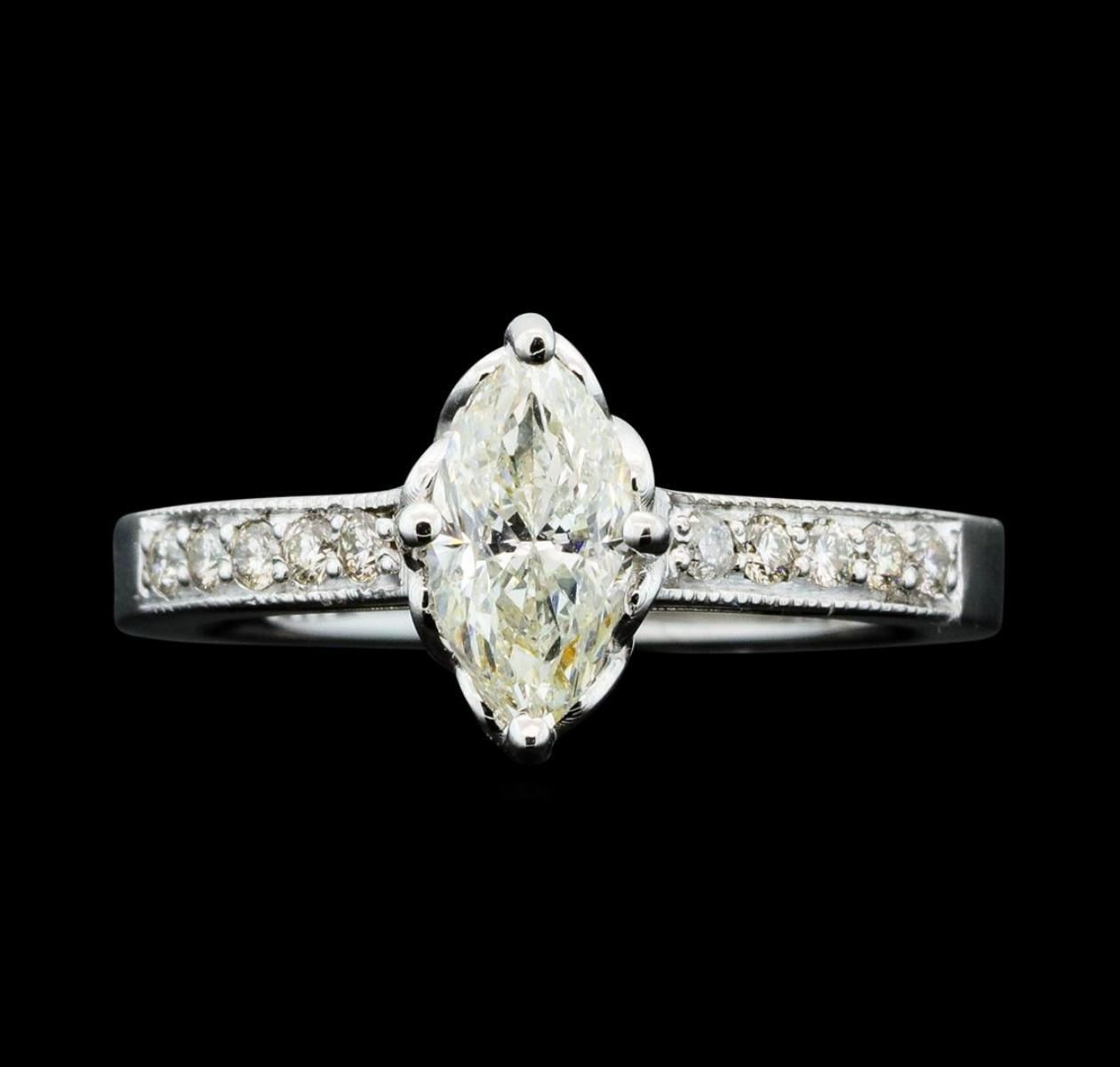One electronically tested 14KT white gold lady's cast wedding ring with a cathedral shank with a bright polish with milgrain detailing finish. The featured lady's ring has a shank measuring 2.61 millimeters wide. Identified with markings of '14K'. Condition is new, good workmanship. Containing: One prong set marquise shaped cut diamond, measuring 8.90 x 4.70 x 3.56mm (depth est.) , 15.00.%. GTCF approximate weight of 1.02ct. Graded in the setting. Clarity SI-2. Color: I - J Cut Good Ten prong set round brilliant cut diamonds, measuring 1.80 - 1.70 x 1.05mm (depth est.) approximate total weight of 10 Stones = 0.19ct. Graded in the setting. Clarity SI-1 to I-1. Color: H - I Cut Very Good. Total Weight of Diamonds 1.21ct.. Total Weight of Ring 4.80gm. GAS Appraised.