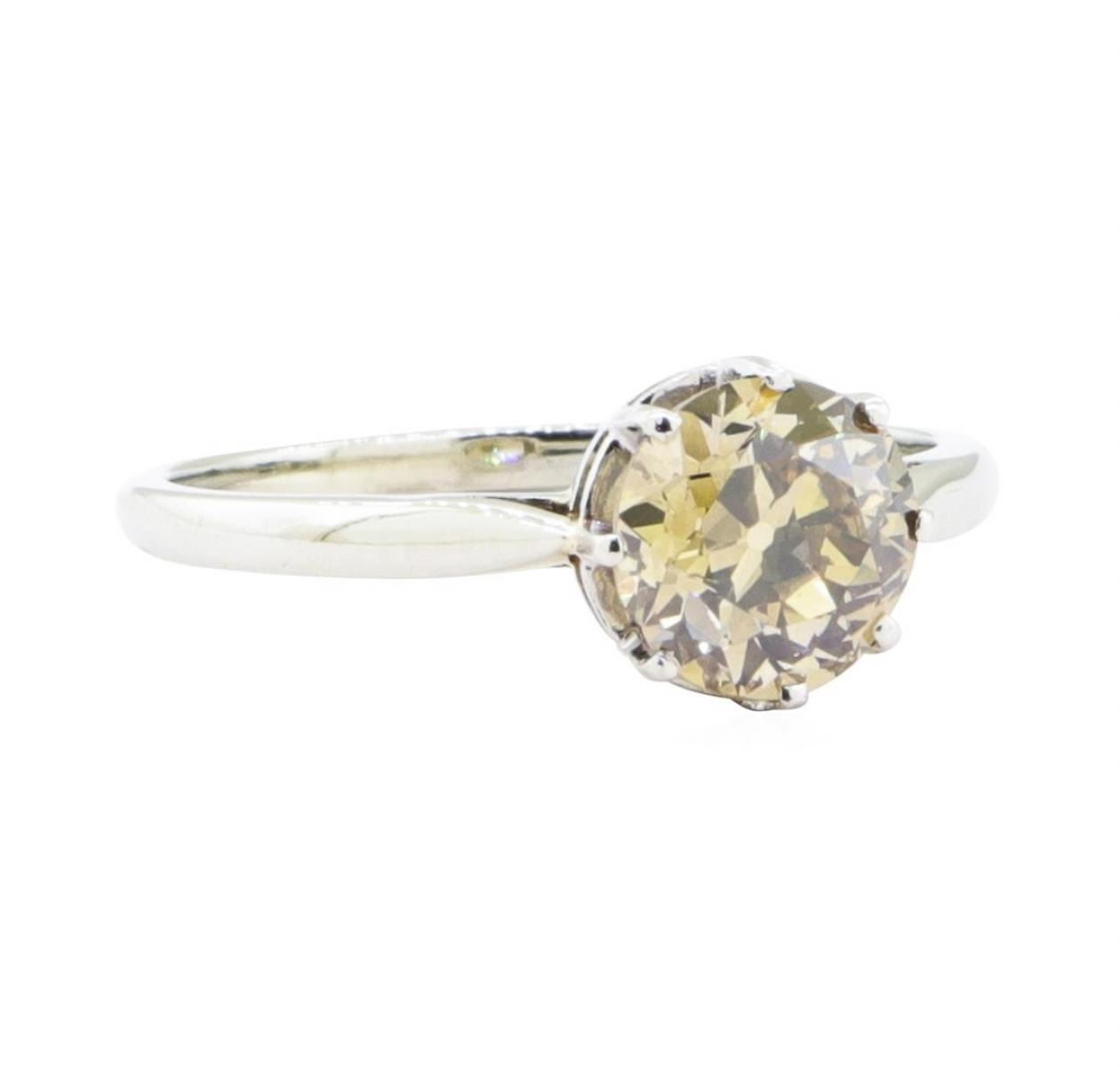 One electronically tested 14KT white gold lady's combination cast & assembled fashion solitatire ring with a bright polish finish. The featured lady's ring has a shank measuring 1.40 millimeters in width. Condition is Good. Containing: One prong set old mine cut diamond, measuring 6.85 - 6.74 x 3.91mm (depth est.) approximate weight of 1.21ct. Graded in the setting. Color Fancy Brown-Yellow Clarity VS-2 Cut Very Good. Total Weight of Diamonds 1.21ct.. Total Weight of Ring 2.30gm GAS Appraised at $12400.00. GAS Appraised.