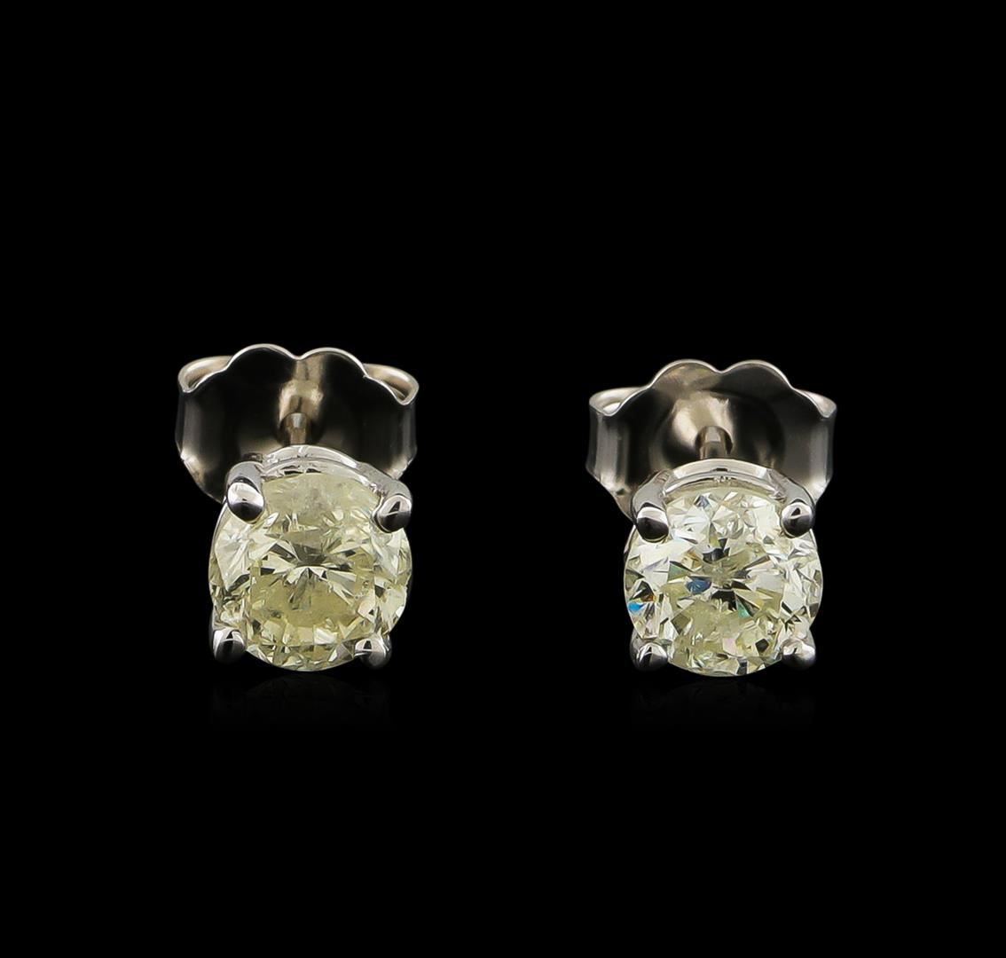One pair electronically tested 14KT white gold lady's cast stud earrings with friction posts with a basket setting with a bright polish finish. Identified with markings of "14K". Condition is new, good workmanship. Containing: Two prong set round brilliant cut diamonds, measuring 5.22 - 5.05 x 3.60mm (depth est.) , 3.00.%. GTCF approximate total weight of 2 Stones = 1.21ct. Graded in the setting. Clarity: I-1 to I-2. Color: I - Good. Total Weight of Diamonds 1.21ct. Total Weight of Earrings 1.20gm GAS Appraised at $4,890.00.