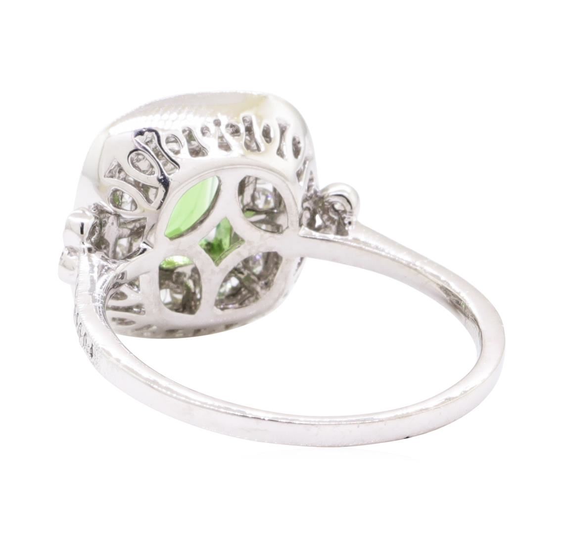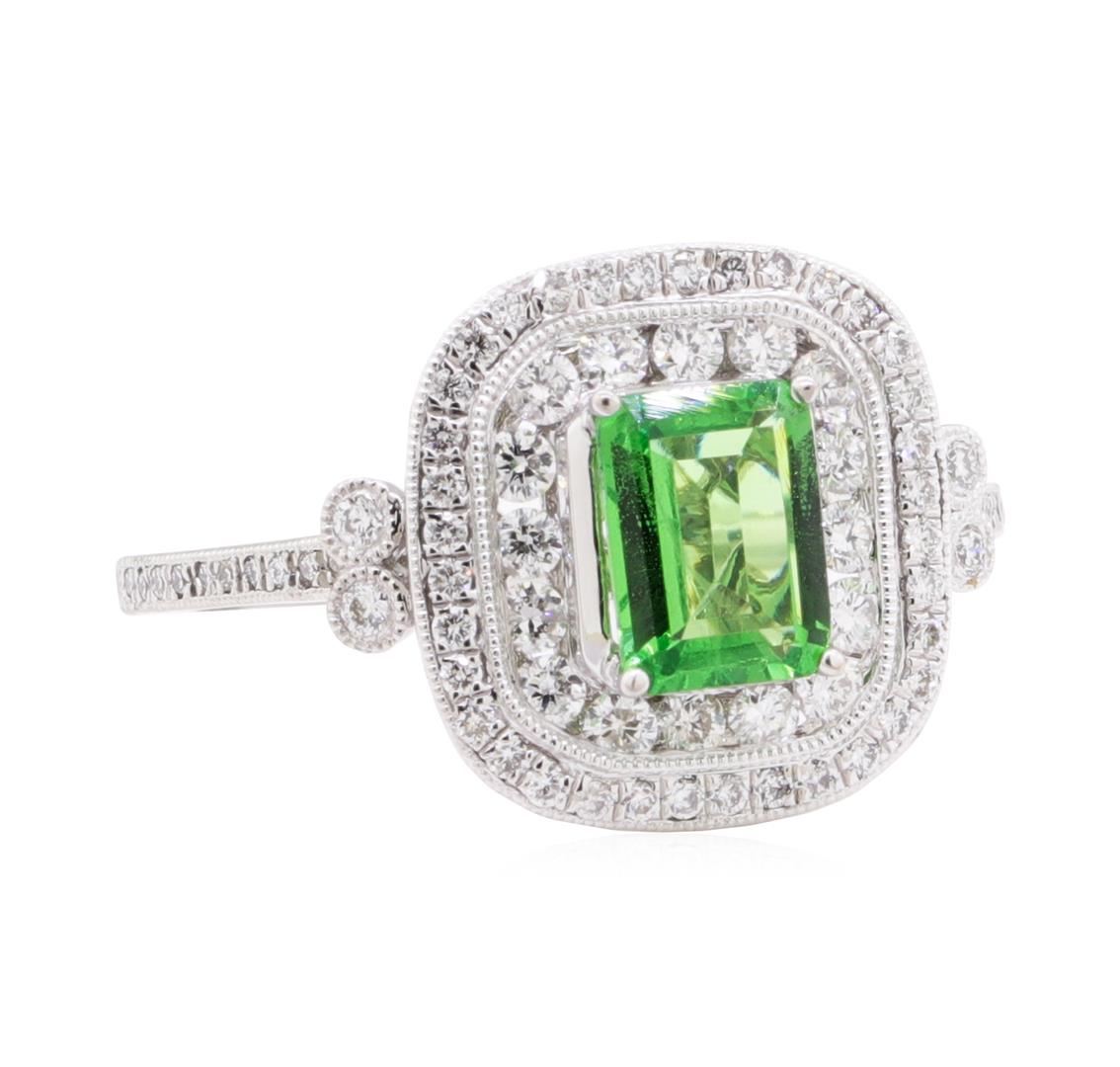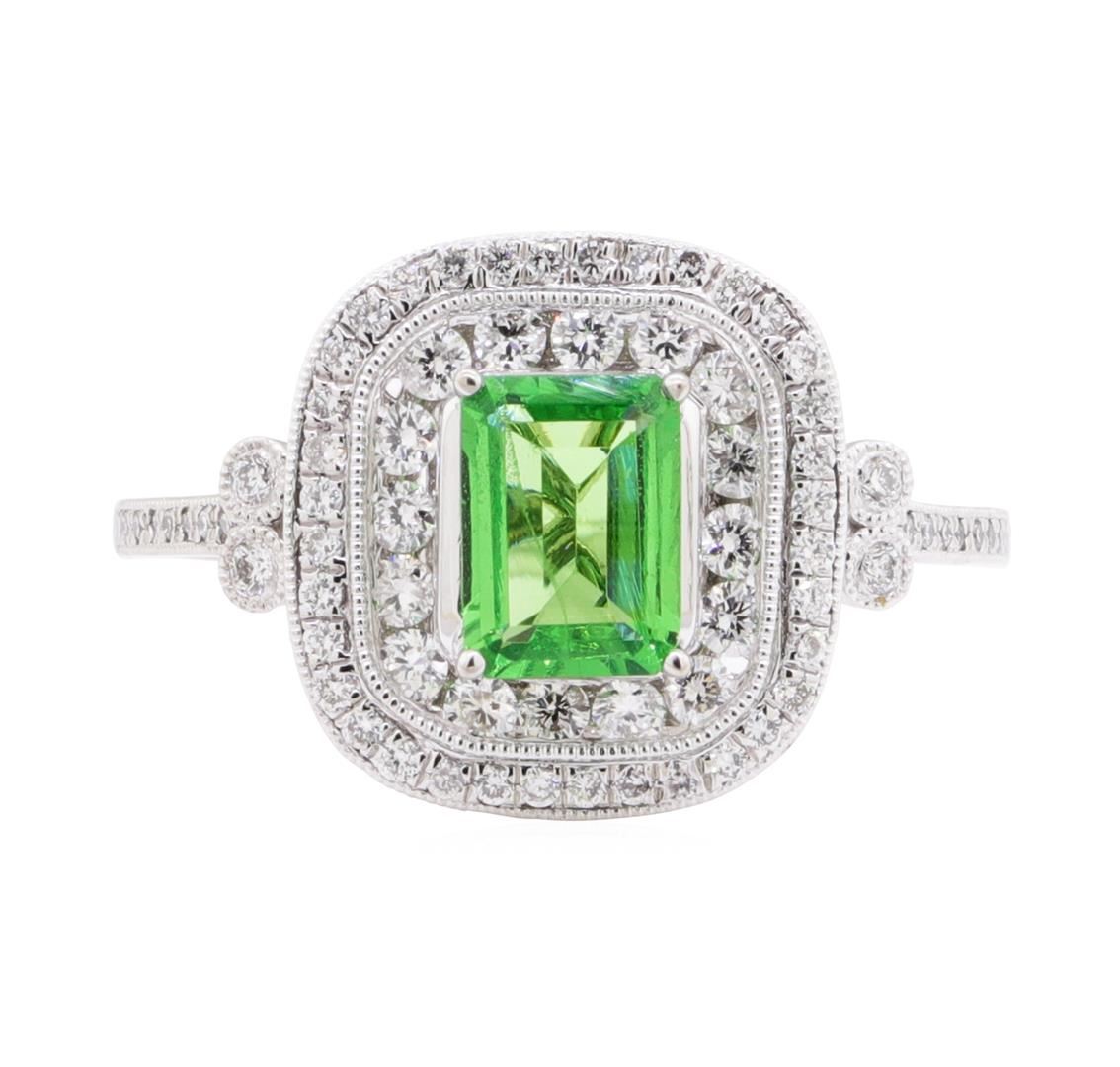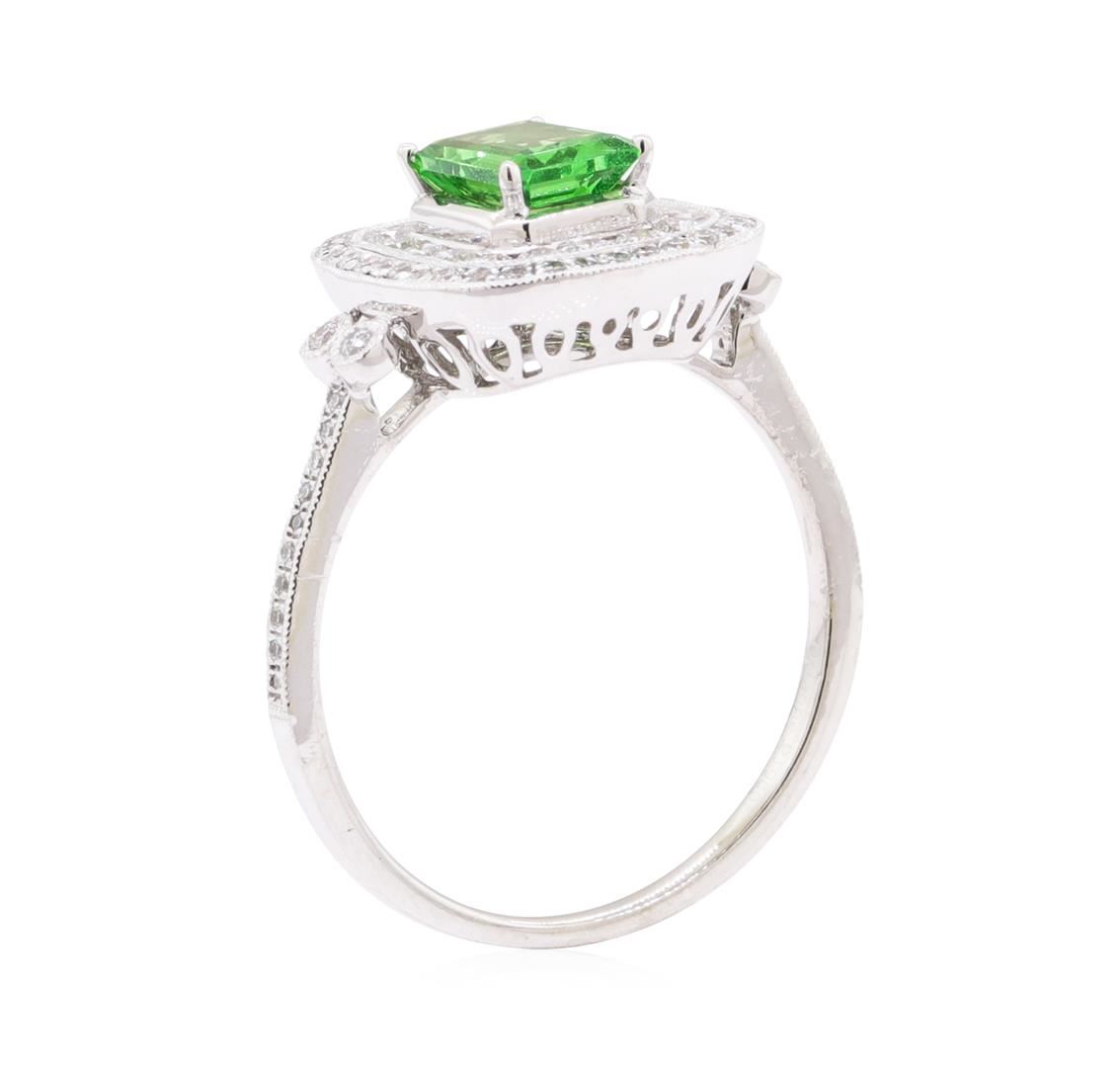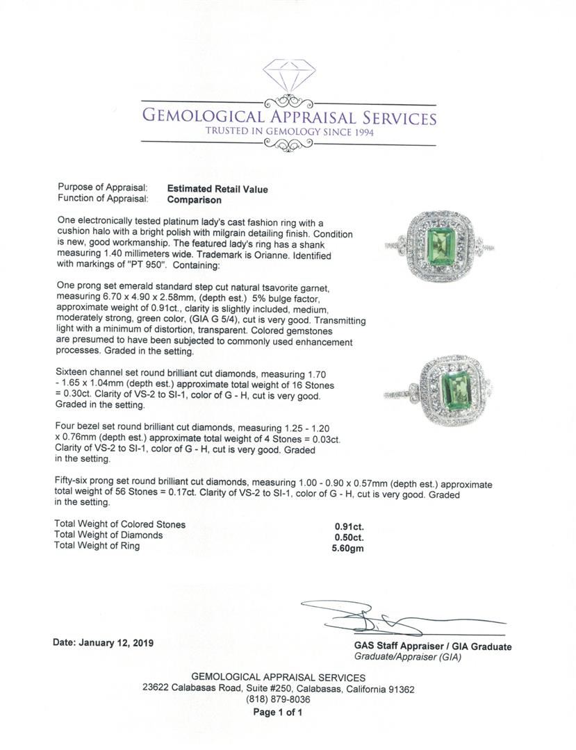 One electronically tested platinum lady's cast fashion ring with a cushion halo with a bright polish with milgrain detailing finish. The featured lady's ring has a shank measuring 1.40 millimeters wide. Trademark is Orianne. Identified with markings of 'PT 950'. Condition is new, good workmanship. Containing: One prong set emerald standard step cut natural tsavorite garnet, measuring 6.70 x 4.90 x 2.58mm, (depth est.) 5%. bulge factor, approximate weight of 0.91ct., clarity is slightly included, medium, moderately strong, green color, (GIA G 5/4), cut is very good. Transmitting light with a minimum of distortion, transparent. Colored gemstones are presumed to have been subjected to commonly used enhancement processes. Graded in the setting. Sixteen channel set round brilliant cut diamonds, measuring 1.70 - 1.65 x 1.04mm (depth est.) approximate total weight of 16 Stones = 0.30ct. Graded in the setting. Color G - H Clarity VS-2 to SI-1 Cut Very Good Four bezel set round brilliant cut diamonds, measuring 1.25 - 1.20 x 0.76mm (depth est.) approximate total weight of 4 Stones = 0.03ct. Graded in the setting. Color G - H Clarity VS-2 to SI-1 Cut Very Good Fifty-Six prong set round brilliant cut diamonds, measuring 1.00 - 0.90 x 0.57mm (depth est.) approximate total weight of 56 Stones = 0.17ct. Graded in the setting. Color G - H Clarity VS-2 to SI-1 Cut Very Good. Total Weight of Colored Stones 0.91ct.. Total Weight of Diamonds 0.50ct.. Total Weight of Ring 5.60gm GAS Appraised at $4400.00. GAS Appraised at $4,400.00.