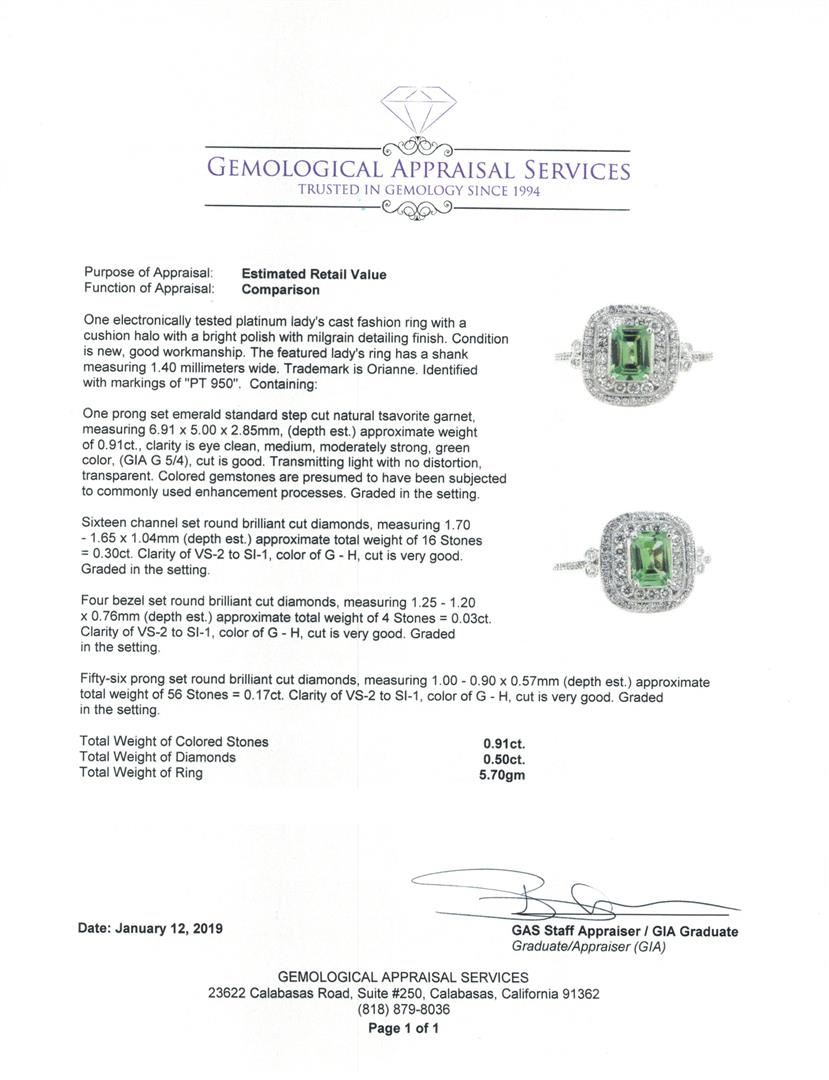 One electronically tested platinum lady's cast fashion ring with a cushion halo with a bright polish with milgrain detailing finish. The featured lady's ring has a shank measuring 1.40 millimeters wide. Trademark is Orianne. Identified with markings of 'PT 950'. Condition is new, good workmanship. Containing: One prong set emerald standard step cut natural tsavorite garnet, measuring 6.91 x 5.00 x 2.85mm, (depth est.) approximate weight of 0.91ct., clarity is eye clean, medium, moderately strong, green color, (GIA G 5/4), cut is good. Transmitting light with no distortion, transparent. Colored gemstones are presumed to have been subjected to commonly used enhancement processes. Graded in the setting. Sixteen channel set round brilliant cut diamonds, measuring 1.70 - 1.65 x 1.04mm (depth est.) approximate total weight of 16 Stones = 0.30ct. Graded in the setting. Color G - H Clarity VS-2 to SI-1 Cut Very Good Four bezel set round brilliant cut diamonds, measuring 1.25 - 1.20 x 0.76mm (depth est.) approximate total weight of 4 Stones = 0.03ct. Graded in the setting. Color G - H Clarity VS-2 to SI-1 Cut Very Good Fifty-Six prong set round brilliant cut diamonds, measuring 1.00 - 0.90 x 0.57mm (depth est.) approximate total weight of 56 Stones = 0.17ct. Graded in the setting. Color G - H Clarity VS-2 to SI-1 Cut Very Good. Total Weight of Colored Stones 0.91ct.. Total Weight of Diamonds 0.50ct.. Total Weight of Ring 5.70gm GAS Appraised at $4410.00. GAS Appraised at $4,410.00.