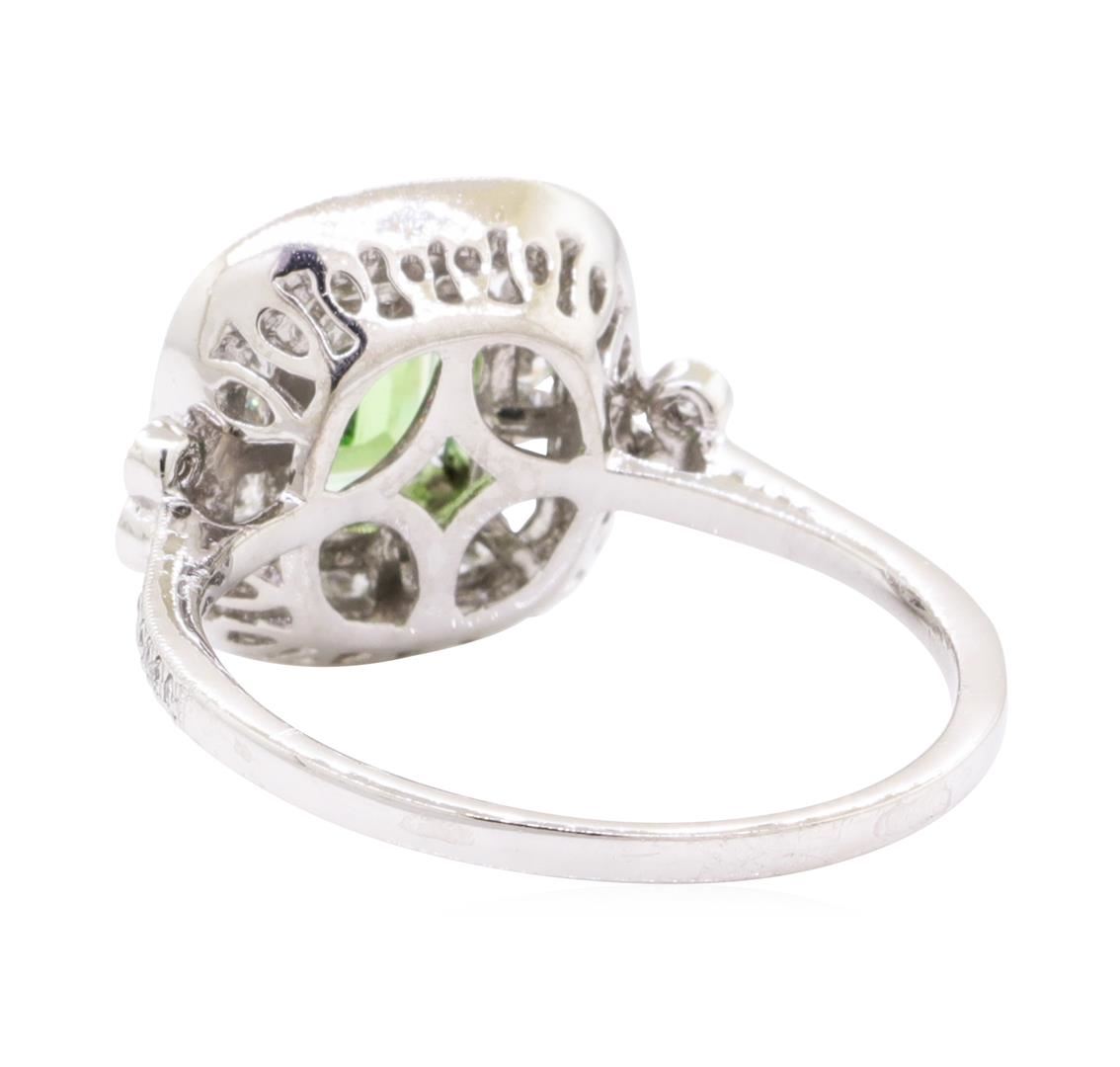 One electronically tested platinum lady's cast fashion ring with a cushion halo with a bright polish with milgrain detailing finish. The featured lady's ring has a shank measuring 1.40 millimeters wide. Trademark is Orianne. Identified with markings of 'PT 950'. Condition is new, good workmanship. Containing: One prong set emerald standard step cut natural tsavorite garnet, measuring 6.91 x 5.00 x 2.85mm, (depth est.) approximate weight of 0.91ct., clarity is eye clean, medium, moderately strong, green color, (GIA G 5/4), cut is good. Transmitting light with no distortion, transparent. Colored gemstones are presumed to have been subjected to commonly used enhancement processes. Graded in the setting. Sixteen channel set round brilliant cut diamonds, measuring 1.70 - 1.65 x 1.04mm (depth est.) approximate total weight of 16 Stones = 0.30ct. Graded in the setting. Color G - H Clarity VS-2 to SI-1 Cut Very Good Four bezel set round brilliant cut diamonds, measuring 1.25 - 1.20 x 0.76mm (depth est.) approximate total weight of 4 Stones = 0.03ct. Graded in the setting. Color G - H Clarity VS-2 to SI-1 Cut Very Good Fifty-Six prong set round brilliant cut diamonds, measuring 1.00 - 0.90 x 0.57mm (depth est.) approximate total weight of 56 Stones = 0.17ct. Graded in the setting. Color G - H Clarity VS-2 to SI-1 Cut Very Good. Total Weight of Colored Stones 0.91ct.. Total Weight of Diamonds 0.50ct.. Total Weight of Ring 5.70gm GAS Appraised at $4410.00. GAS Appraised at $4,410.00.