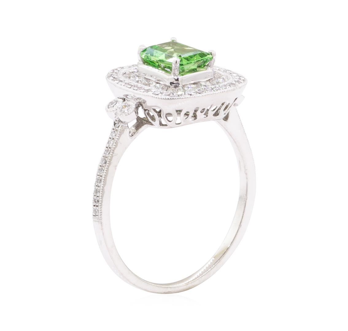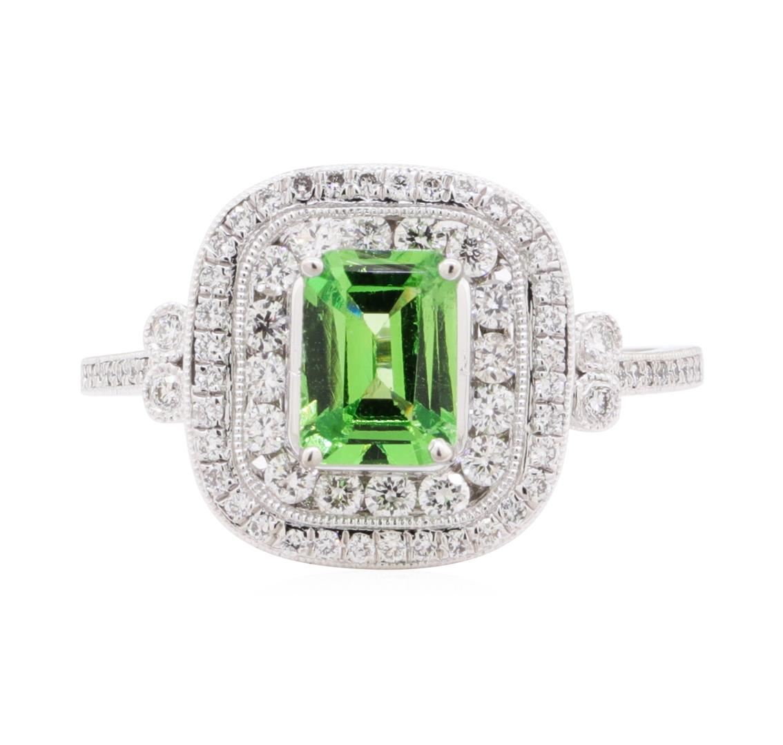 One electronically tested platinum lady's cast fashion ring with a cushion halo with a bright polish with milgrain detailing finish. The featured lady's ring has a shank measuring 1.40 millimeters wide. Trademark is Orianne. Identified with markings of 'PT 950'. Condition is new, good workmanship. Containing: One prong set emerald standard step cut natural tsavorite garnet, measuring 6.91 x 5.00 x 2.85mm, (depth est.) approximate weight of 0.91ct., clarity is eye clean, medium, moderately strong, green color, (GIA G 5/4), cut is good. Transmitting light with no distortion, transparent. Colored gemstones are presumed to have been subjected to commonly used enhancement processes. Graded in the setting. Sixteen channel set round brilliant cut diamonds, measuring 1.70 - 1.65 x 1.04mm (depth est.) approximate total weight of 16 Stones = 0.30ct. Graded in the setting. Color G - H Clarity VS-2 to SI-1 Cut Very Good Four bezel set round brilliant cut diamonds, measuring 1.25 - 1.20 x 0.76mm (depth est.) approximate total weight of 4 Stones = 0.03ct. Graded in the setting. Color G - H Clarity VS-2 to SI-1 Cut Very Good Fifty-Six prong set round brilliant cut diamonds, measuring 1.00 - 0.90 x 0.57mm (depth est.) approximate total weight of 56 Stones = 0.17ct. Graded in the setting. Color G - H Clarity VS-2 to SI-1 Cut Very Good. Total Weight of Colored Stones 0.91ct.. Total Weight of Diamonds 0.50ct.. Total Weight of Ring 5.70gm GAS Appraised at $4410.00. GAS Appraised.