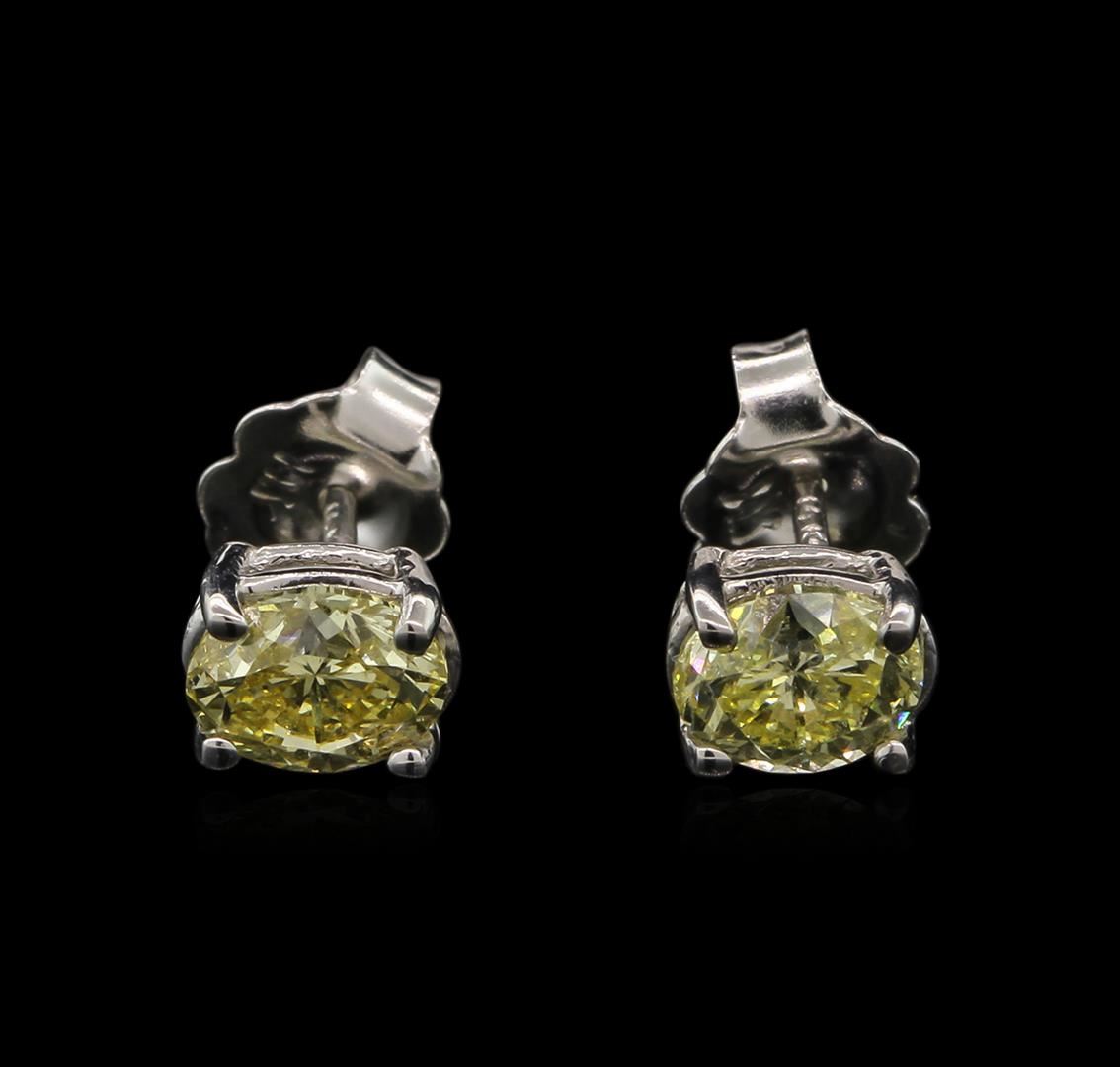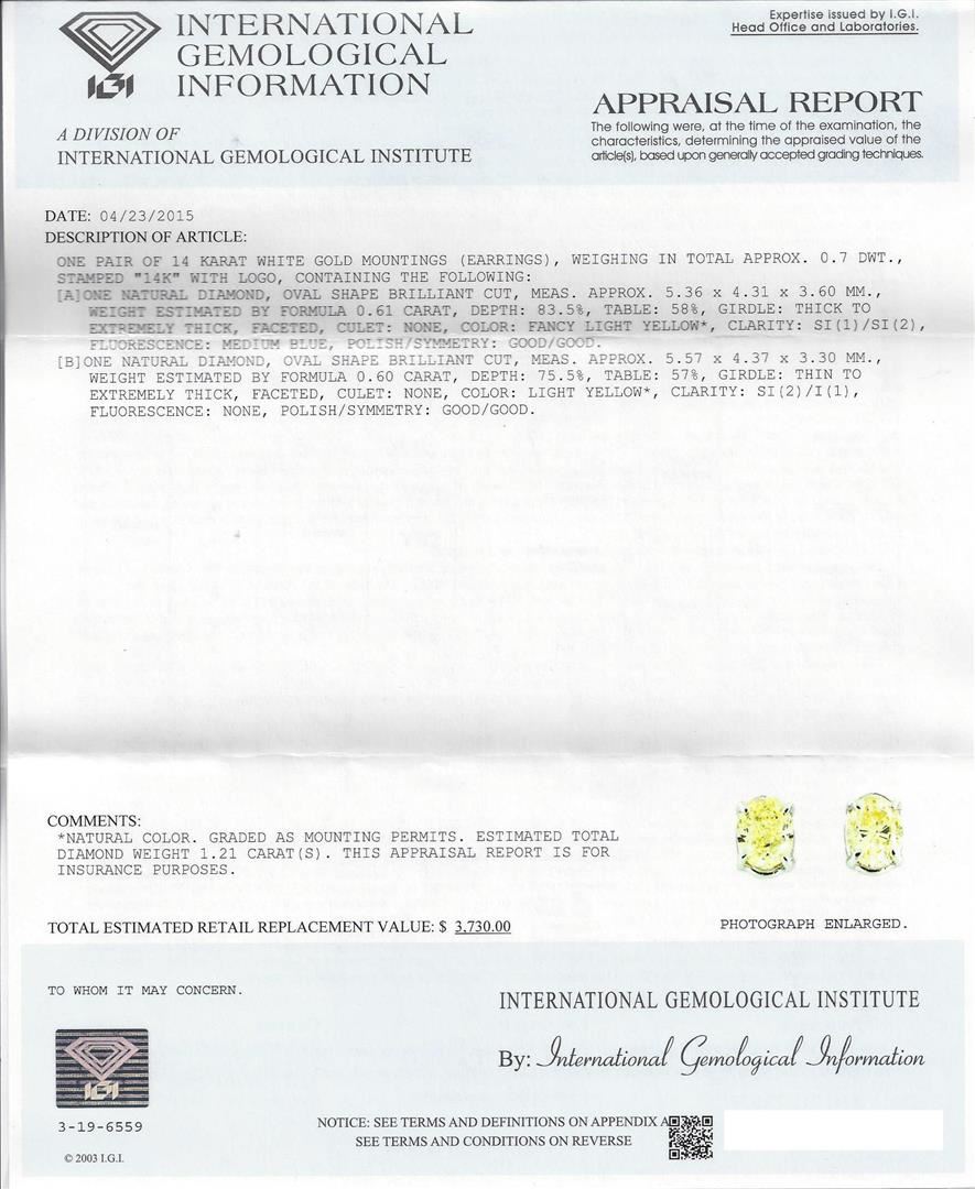 One pair of 14 karat white gold mountings (earrings), weighing in total approx. 0.7 DWT., stamped "14K" with logo, containing the following: [A] One natural diamond, oval shape brilliant cut, meas. Approx. 5.36 x 4.31 x 3.60 mm., weight estimated by formula 0.61 carat, depth: 83.5%, table: 58%, girdle: thick to extremely thick, faceted, culet: none, color: fancy light yellow, clarity: SI (1) / SI (2), fluorescence: medium blue, polish/symmetry: good/good. [B] One natural diamond, oval shape brilliant cut, meas. approx. 5.57 x 4.37 x 3.30 mm., weight estimated by formula 0.60 carat, depth: 75.5%, table: 57%, girdle: think to extremely thick, faceted, culet: none, color: light yellow, clarity: SI (2) / I (1), fluorescence: none, polish/symmetry: good/good. IGI Appraised at $3,730.00.