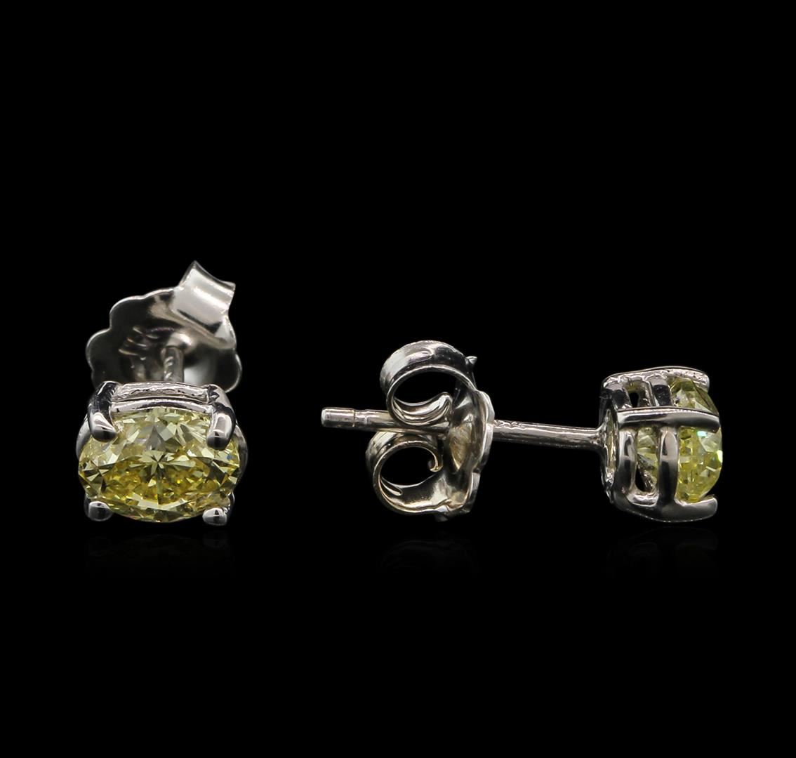 One pair of 14 karat white gold mountings (earrings), weighing in total approx. 0.7 DWT., stamped "14K" with logo, containing the following: [A] One natural diamond, oval shape brilliant cut, meas. Approx. 5.36 x 4.31 x 3.60 mm., weight estimated by formula 0.61 carat, depth: 83.5%, table: 58%, girdle: thick to extremely thick, faceted, culet: none, color: fancy light yellow, clarity: SI (1) / SI (2), fluorescence: medium blue, polish/symmetry: good/good. [B] One natural diamond, oval shape brilliant cut, meas. approx. 5.57 x 4.37 x 3.30 mm., weight estimated by formula 0.60 carat, depth: 75.5%, table: 57%, girdle: think to extremely thick, faceted, culet: none, color: light yellow, clarity: SI (2) / I (1), fluorescence: none, polish/symmetry: good/good. IGI Appraised at $3,730.00.