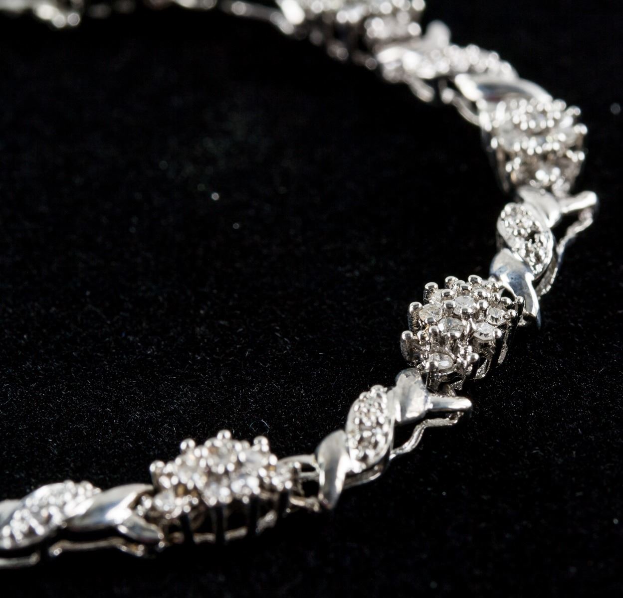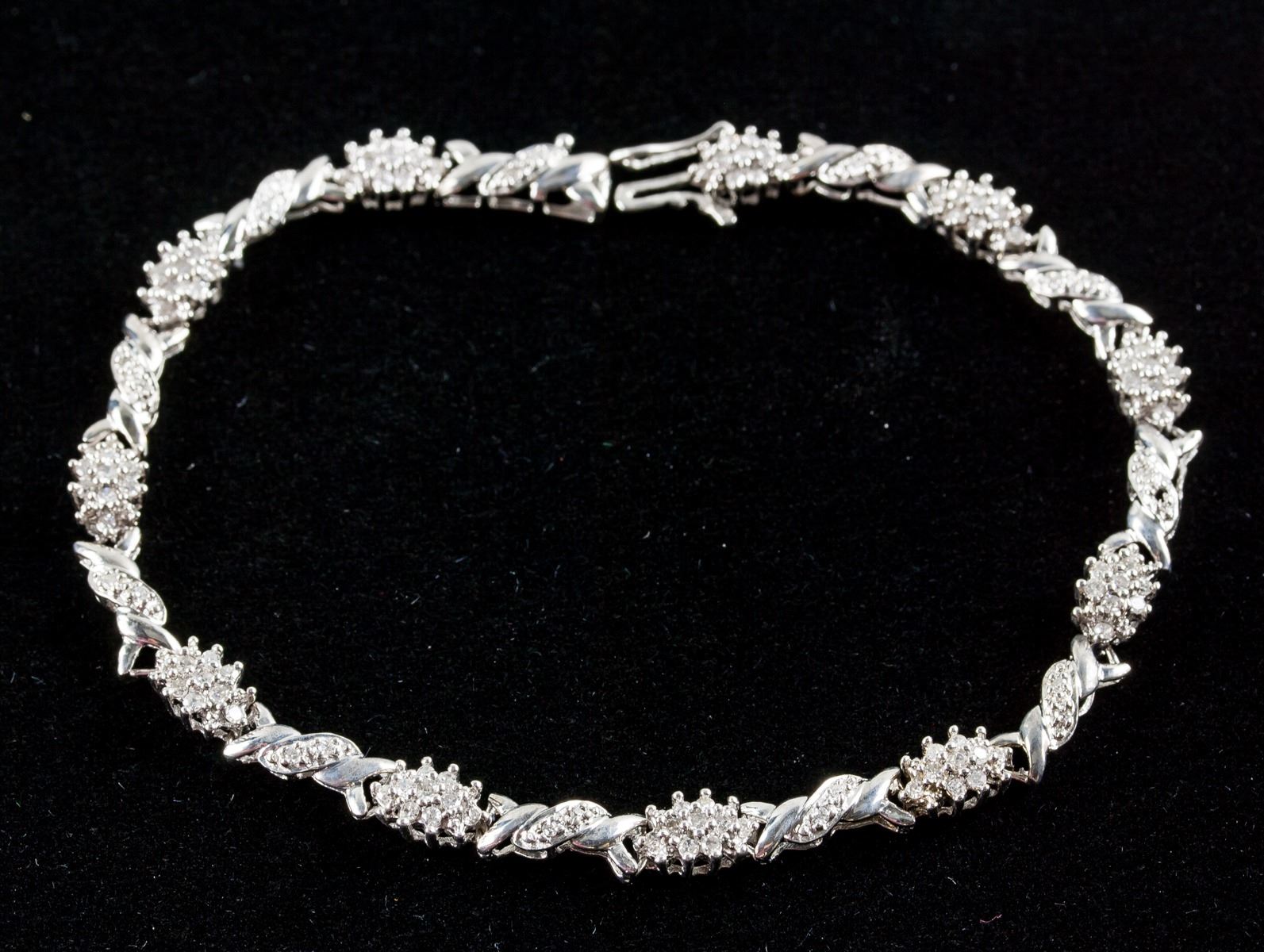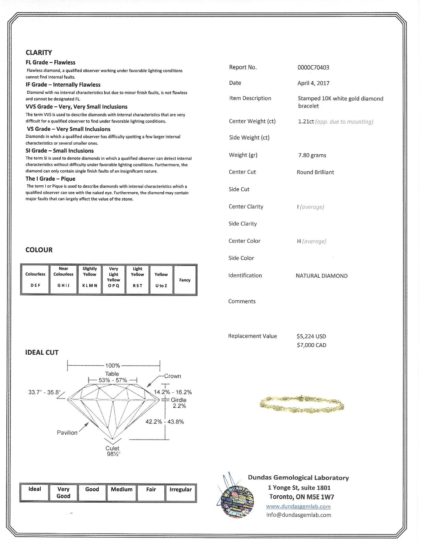 Stamped 10k white gold bracelet. Set with 1.21ct round brilliant cut, I clarity and H colored diamond. Certified replacement value $7000. 7.80 grams.