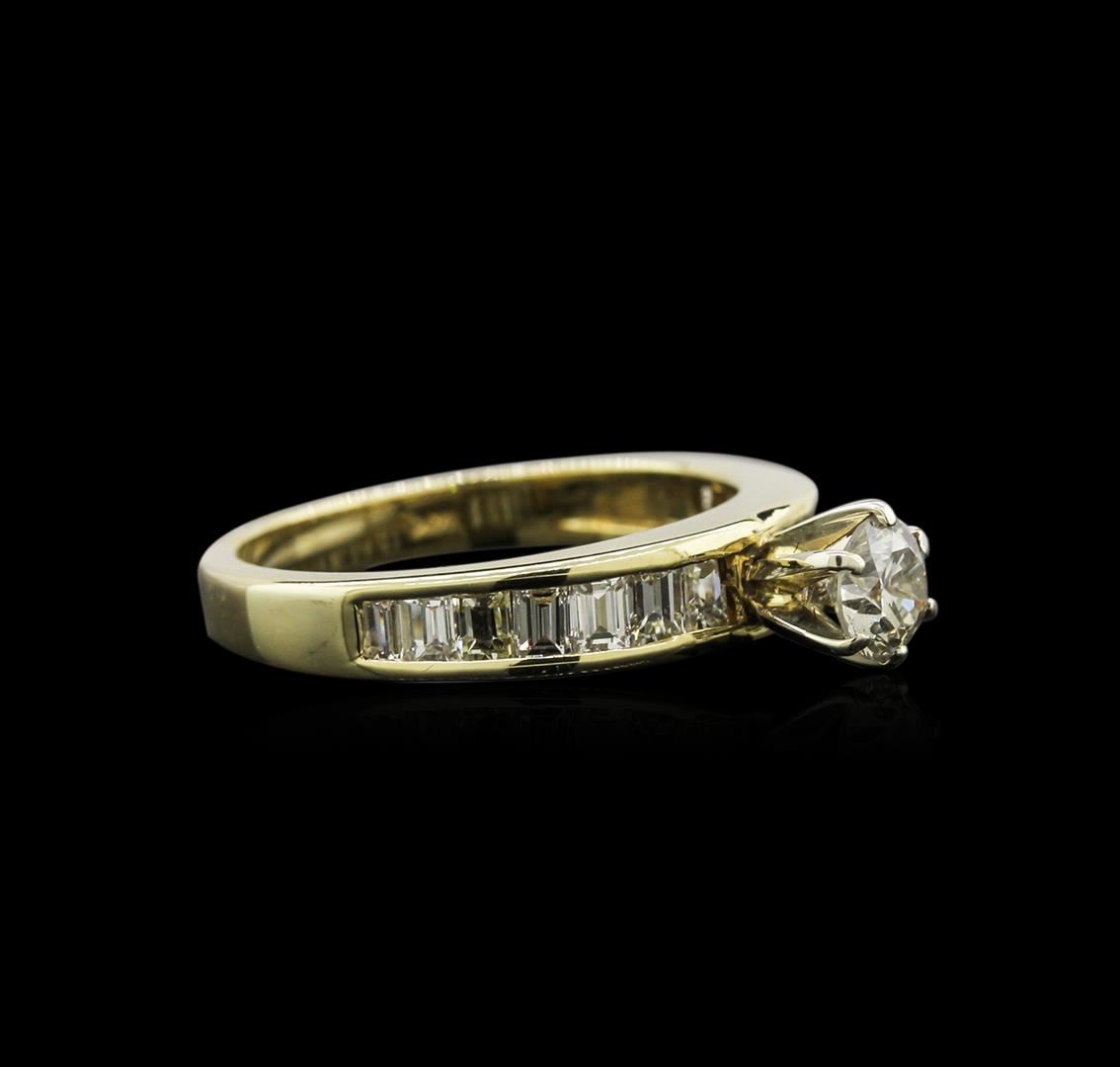 One electronically tested yellow gold ladies cast & assembled diamond ring with a bright polish finish. Condition is new, good workmanship. The featured diamond is supported by diamond set shoulders and completed by a two and one-half millimeter wide band. Identified with markings of1114K". Containing: One prong set round brilliant cut diamond, measuring 4.60 - 4.55 x 3.00mm (depth est.) approximate weight of0.40ct with a strong blue fluorescence. Graded in the setting. Thirteen channel set baguette cut diamonds, measuring from 2.40 x 2.20 x 1.54mm (depth est.) to 2.50 x 1.70x 1.19mm (depth est.) approximate total weight of 13 Stones = 0.8let. Faint secondary color throughout. Graded in the setting. AIG Appraised at $4,860.00.