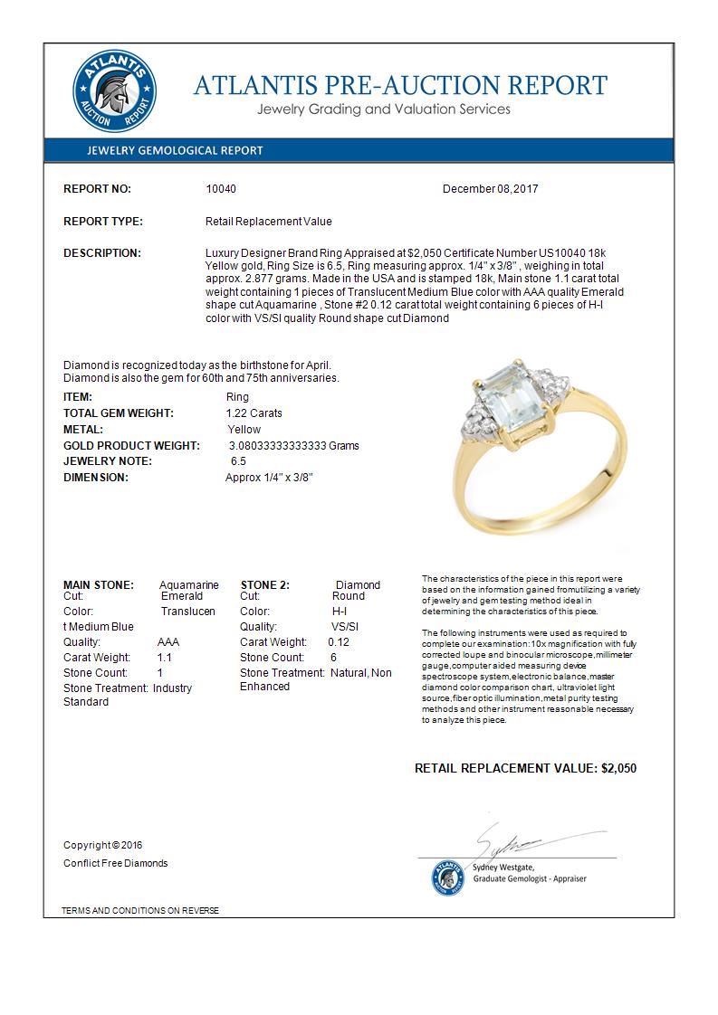 REF-31H3A -10040 ---- 1.22 CTW Aquamarine & Diamond Ring 18K Yellow Gold ---- Luxury Designer Brand Ring Appraised at $2,050 Certificate Number US10040 18k Yellow gold, Ring Size is 6.5, Ring measuring approx. 1/4" x 3/8" , weighing in total approx. 2.877 grams. Made in the USA and is stamped 18k, Main stone 1.1 carat total weight containing 1 pieces of Translucent Medium Blue color with AAA quality Emerald shape cut Aquamarine , Stone #2 0.12 carat total weight containing 6 pieces of H-I color with VS/SI quality Round shape cut Diamond