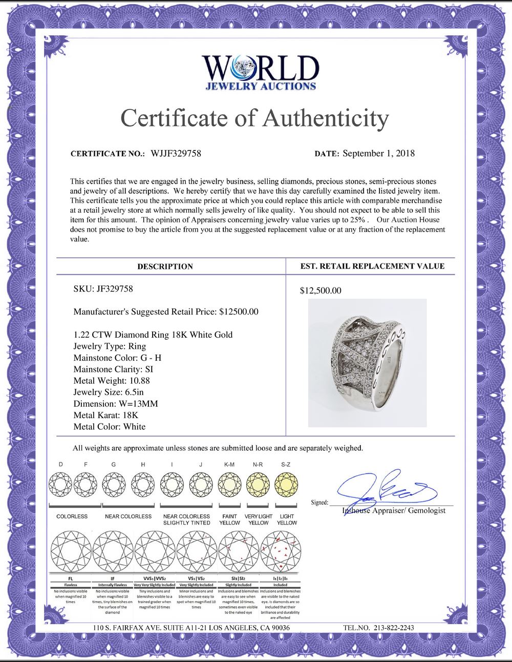 WORLD JEWELRY AUCTION believes to the best of its knowledge that the information presented in any listing has come from reliable sources. Such information is presented solely for the convenience of the Purchaser. WJA makes no warranties of any kind related to the information presented in any listing. WJA further makes no warranties, either express or implied, relating to the value, marketability or condition of the lot described in any listing. Prospective bidders should investigate a lot thoroughly before bidding. By bidding the Bidder acknowledges that Bidder has investigated the lot to his or her satisfaction, or, that Bidder has chosen not to do so, and agrees to accept the lot being bid on with no objections after the sale closes. If you are uncertain please contact us with your questions prior to bidding. If you are still uncertain after we reply, please refrain from bidding. Photos other graphic material contained in any listing of generic or duplicate lots may be stock presentations and not necessarily of the specific lot.