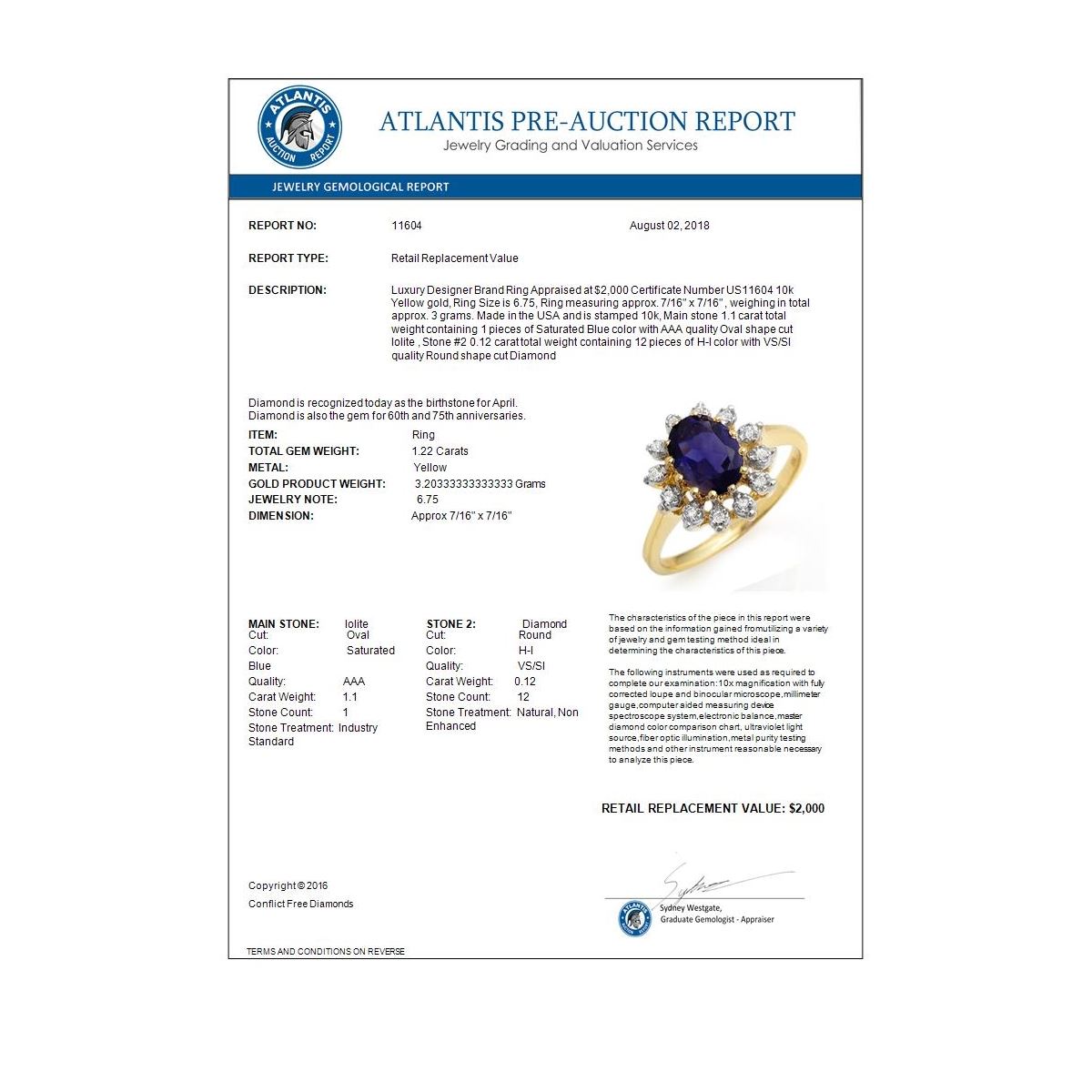 REF-30H5A -11604 ---- 1.22 CTW Iolite & Diamond Ring 10K Yellow Gold ---- Luxury Designer Brand Ring Appraised at $2,000 Certificate Number US11604 10k Yellow gold, Ring Size is 6.75, Ring measuring approx. 7/16" x 7/16" , weighing in total approx. 3 grams. Made in the USA and is stamped 10k, Main stone 1.1 carat total weight containing 1 pieces of Saturated Blue color with AAA quality Oval shape cut Iolite , Stone #2 0.12 carat total weight containing 12 pieces of H-I color with VS/SI quality Round shape cut Diamond