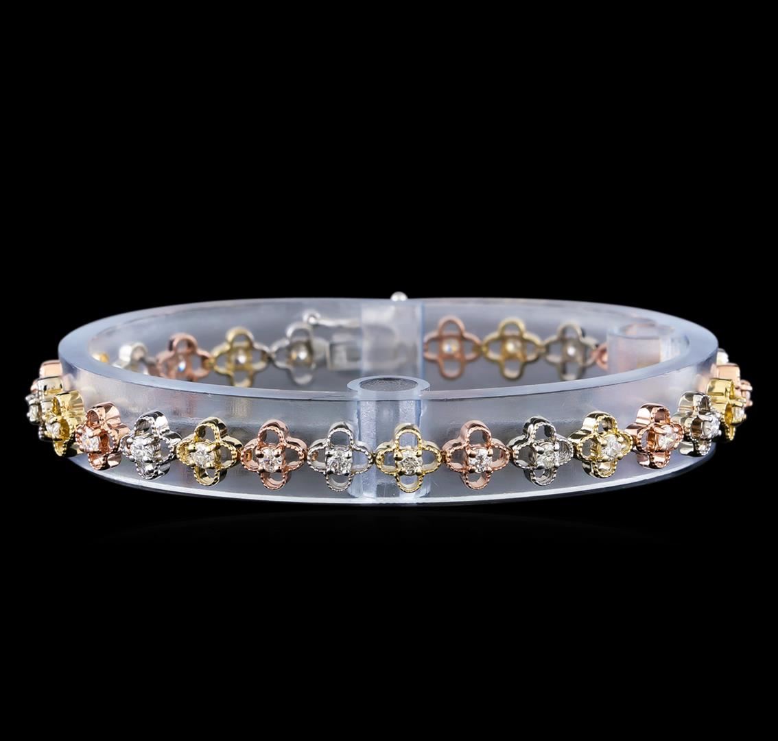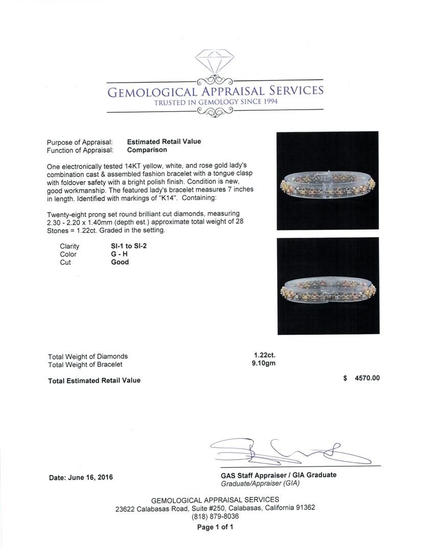 One electronically tested 14KT yellow, white, and rose gold lady's combination cast & assembled fashion bracelet with a tongue clasp with foldover safety with a bright polish finish. The featured lady's bracelet measures 7 inches in length. Identified with markings of "K14". Condition is new, good workmanship. Containing: Twenty-Eight prong set round brilliant cut diamonds, measuring 2.30 - 2.20 x 1.40mm (depth est.) approximate total weight of 28 Stones = 1.22ct. Graded in the setting. Clarity: SI-1 to SI-2. Color: G - H. Cut Good. Total Weight of Diamonds 1.22ct. Total Weight of Bracelet 9.10gm GAS Appraised at $4,570.00.