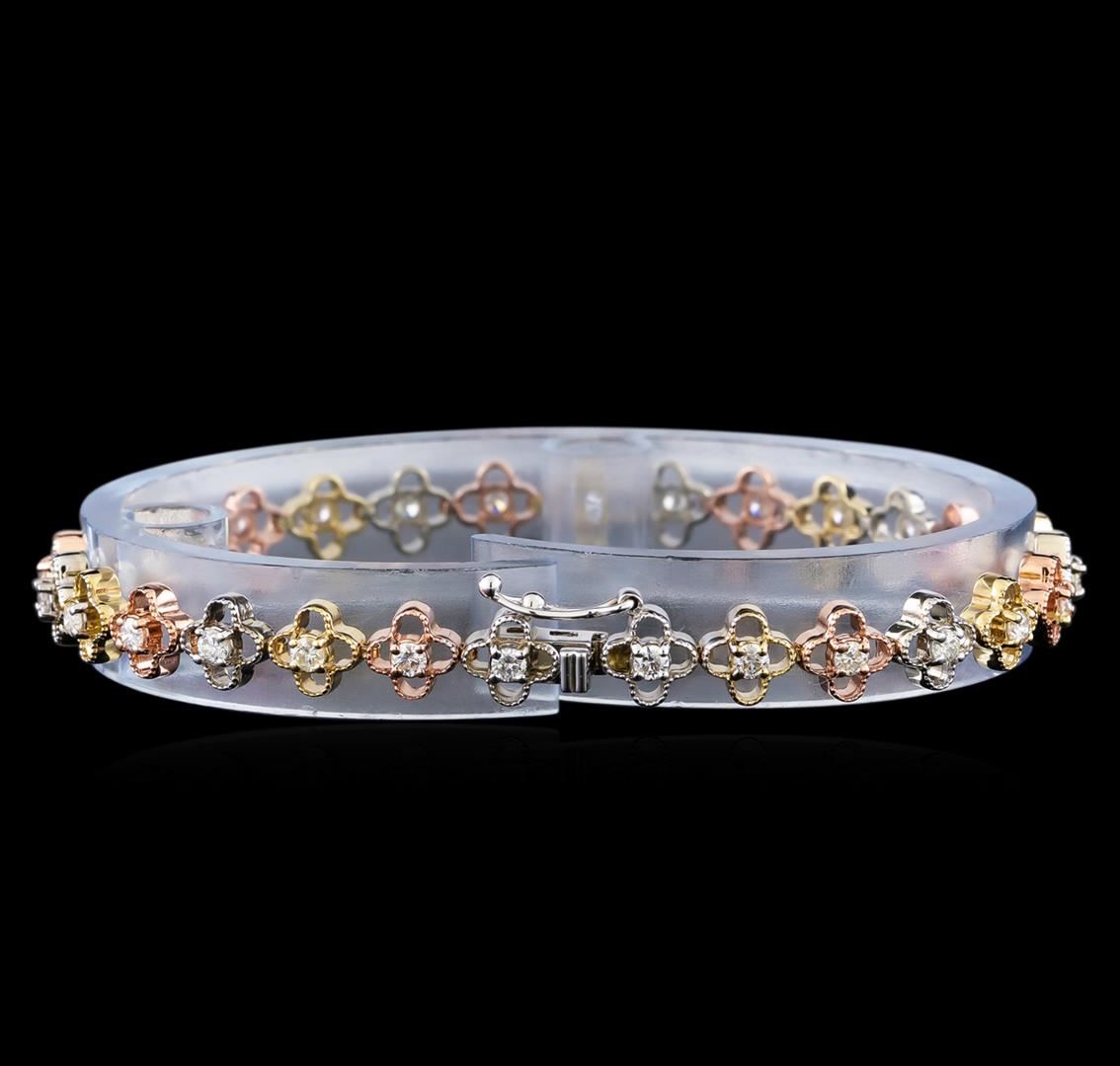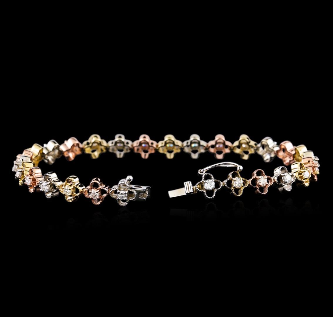 One electronically tested 14KT yellow, white, and rose gold lady's combination cast & assembled fashion bracelet with a tongue clasp with foldover safety with a bright polish finish. The featured lady's bracelet measures 7 inches in length. Identified with markings of "K14". Condition is new, good workmanship. Containing: Twenty-Eight prong set round brilliant cut diamonds, measuring 2.30 - 2.20 x 1.40mm (depth est.) approximate total weight of 28 Stones = 1.22ct. Graded in the setting. Clarity: SI-1 to SI-2. Color: G - H. Cut Good. Total Weight of Diamonds 1.22ct. Total Weight of Bracelet 9.10gm GAS Appraised at $4,570.00.